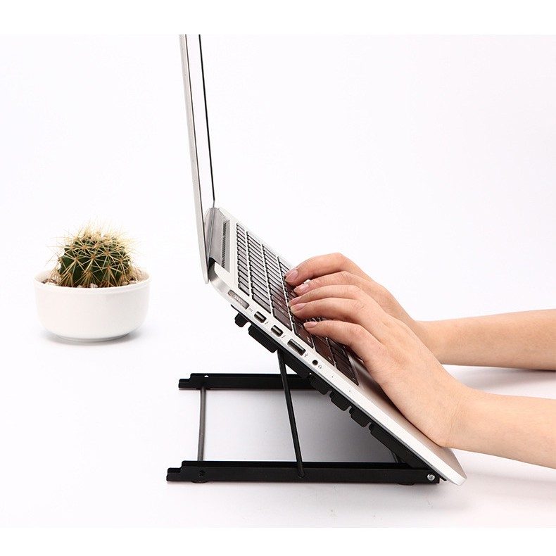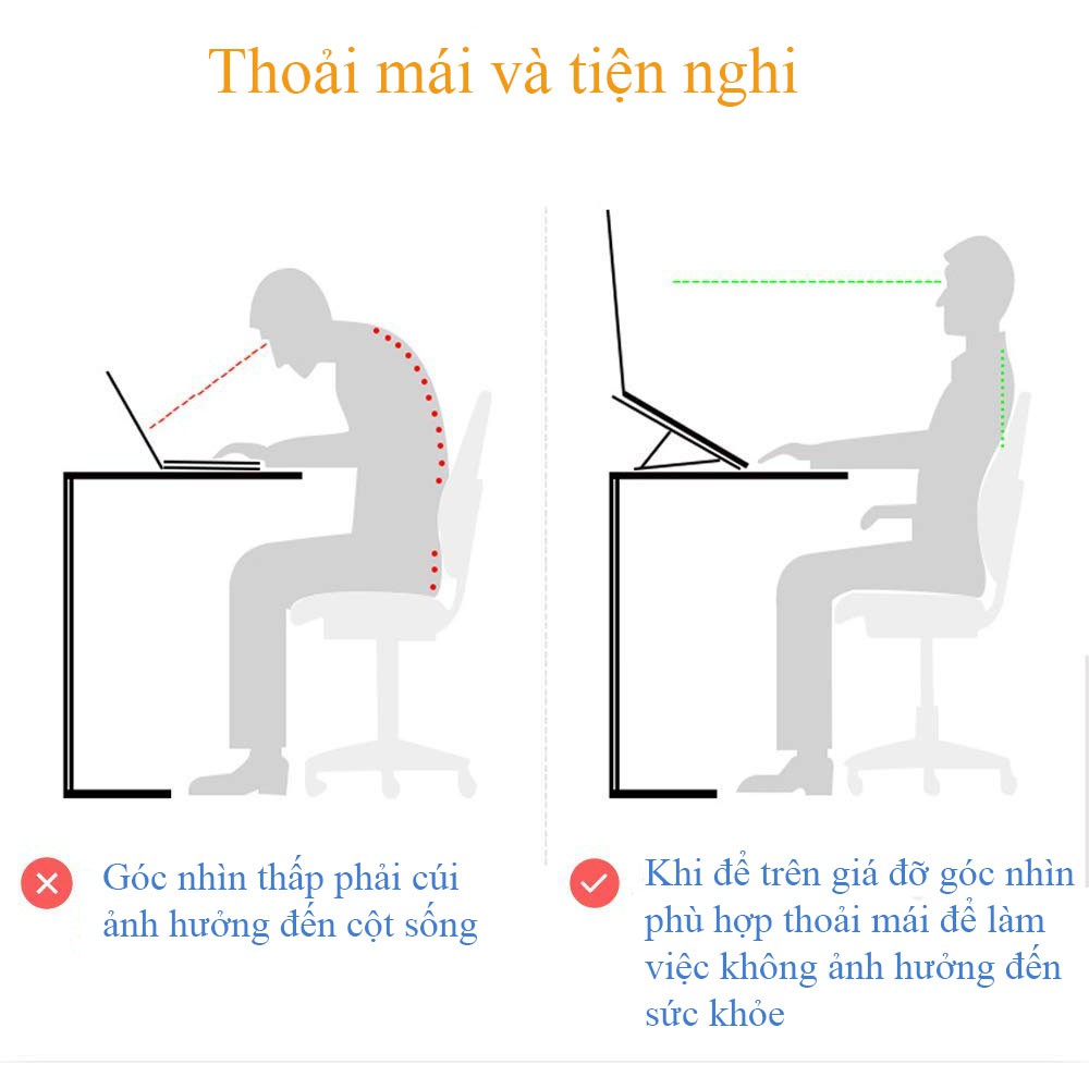 6 góc điều chỉnh khác nhau để thoải mái tối đa khi gõ, đọc và xem, bảo vệ hiệu quả của cột sống cổ. Lưới kim loại thông gió hỗ trợ tản nhiệt giữ cho máy tính xách tay của bạn luôn mát mẻ Đệm silicon chống trầy xước, trơn trượt đảm bảo an toàn cho máy tính của bạn Hợp kim nhôm mạnh mẽ, gọn nhẹ thuận tiện cho bạn để mang nó bất cứ nơi nào Có thể được sử dụng với laptop/ iPad /máy tính bảng /điện thoại... dưới 15inchmàu sắc : trắng , xám , xanh biển, hồng sen