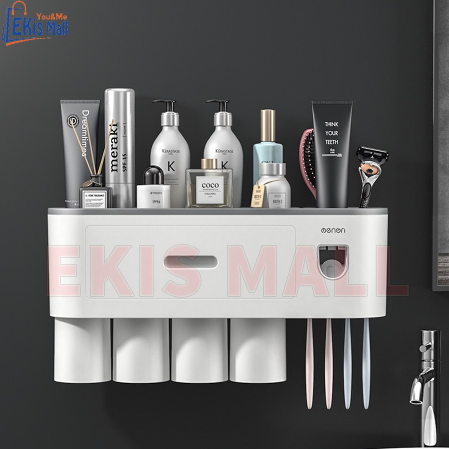 - Sản phẩm gồm: 1 Kệ nhà tắm tích hợp chức năng lấy kem tự động + Cốc hút từ tính + miếng dán tường