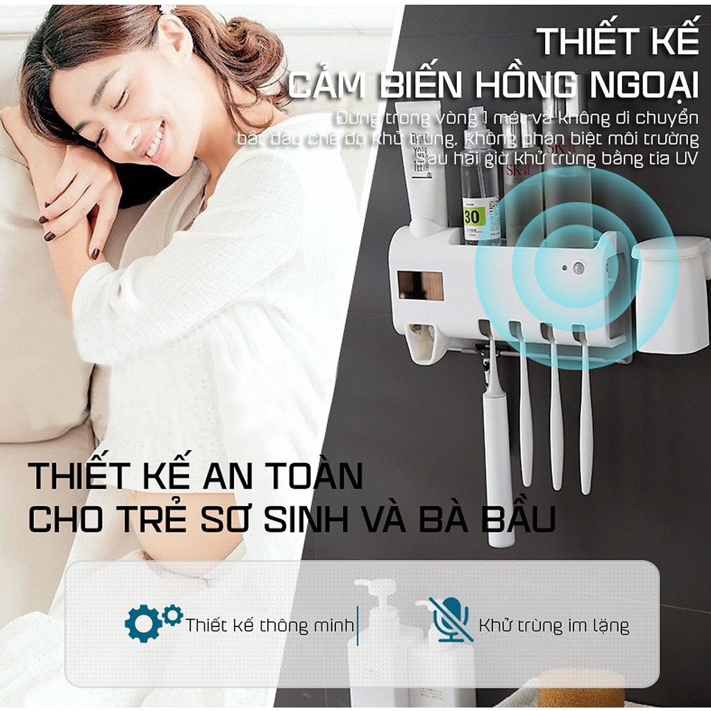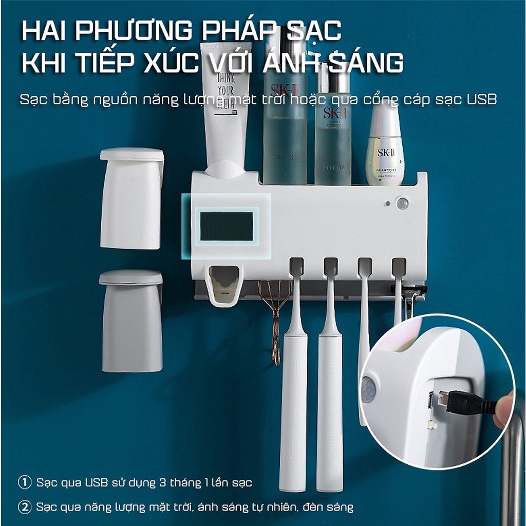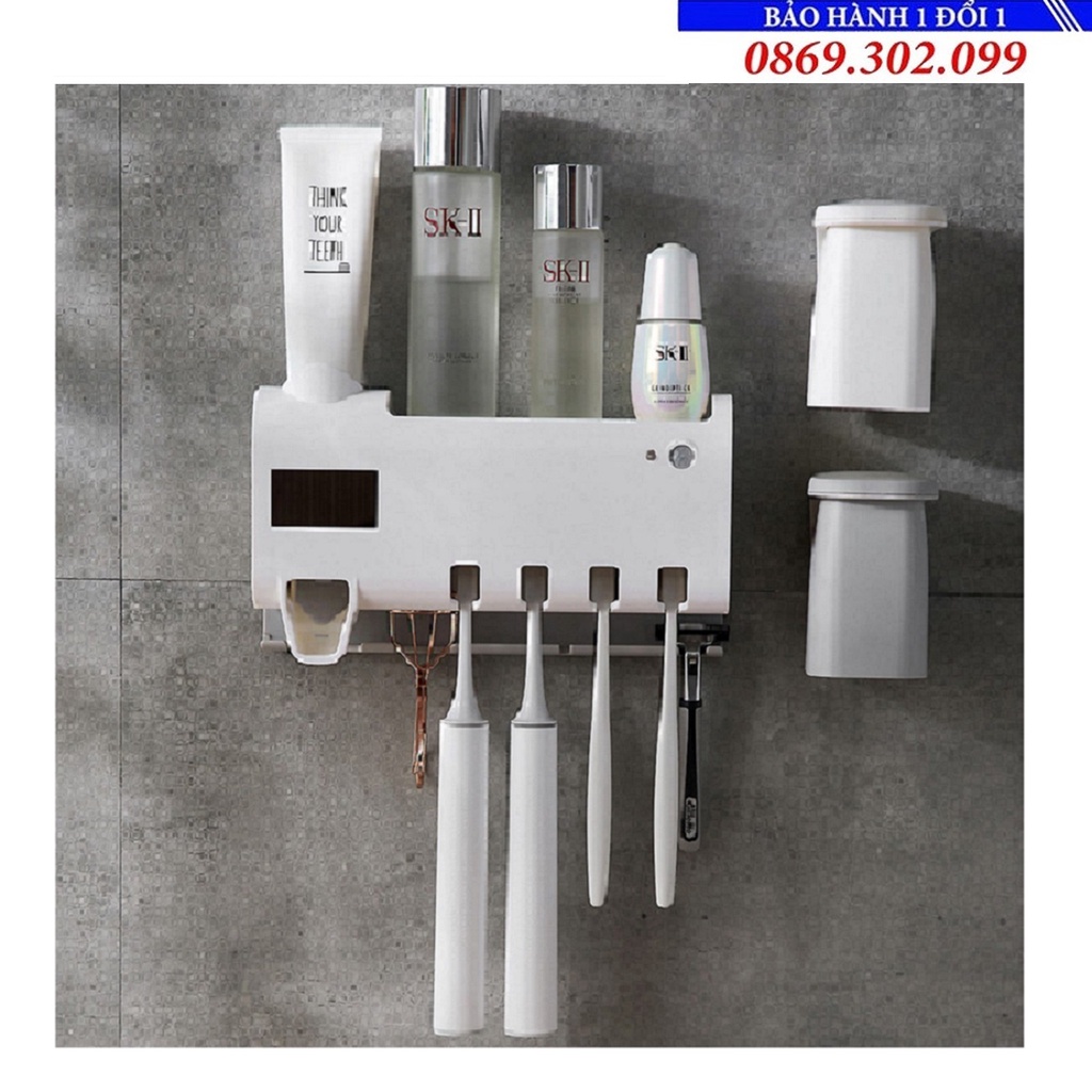 Kệ Đựng Bàn Chải Thông Minh - Hộp đựng bàn chải đánh răng diệt khuẩn bằng tia cực tím UV Kèm 2 Cốc Nam Châm Cao Cấp