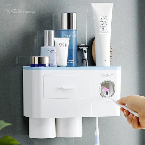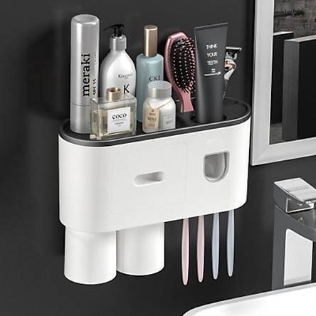 - Bộ sản phẩm gồm: Giá để đồ đa năng Bộ nhả kem đánh răng Tự động + 2 cốc từ tính + bộ dính tường