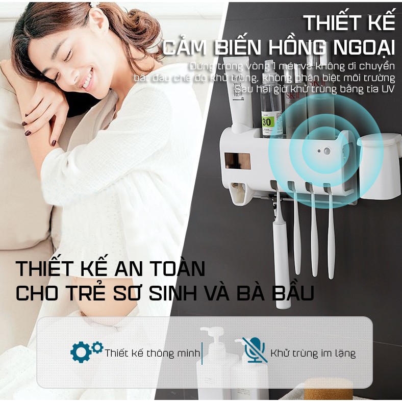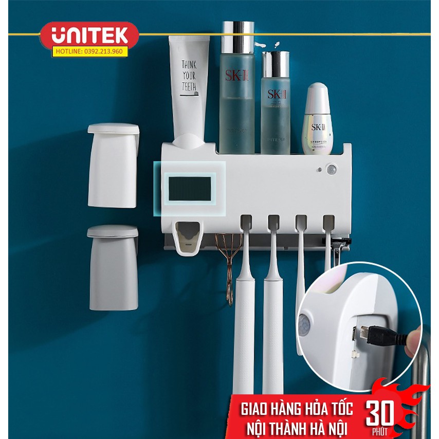 Kệ Đựng Bàn Chải Thông Minh Tự Động Lấy Kem Đánh Răng Kèm 2 Cốc Nam Châm Cao Cấp (Loại Có UV Diệt Khuẩn)