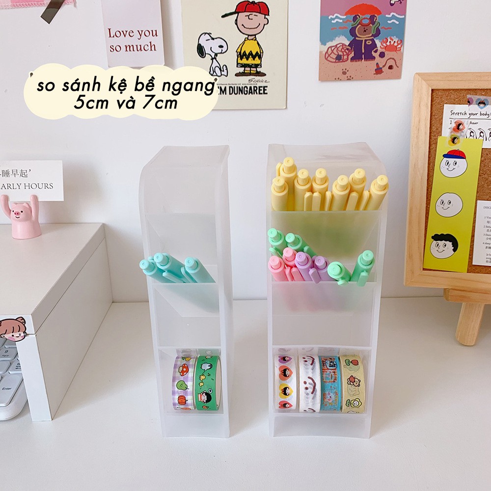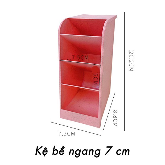 - Kích thước: kệ: 22*9cm, kích thước mỗi hộc trên kệ 9*5*20,5cm, cốc đựng bút: 10*7cm. Cốc trơn không có sticker đính kèm.