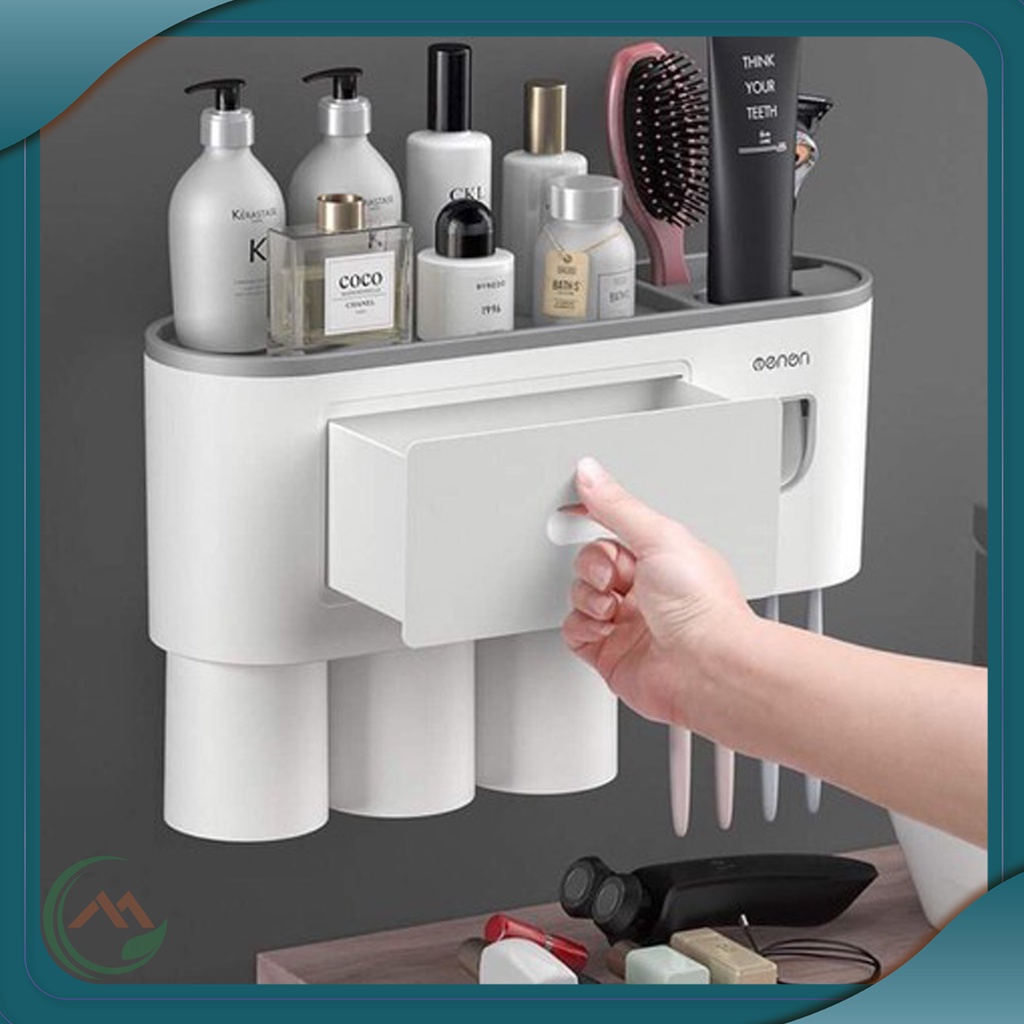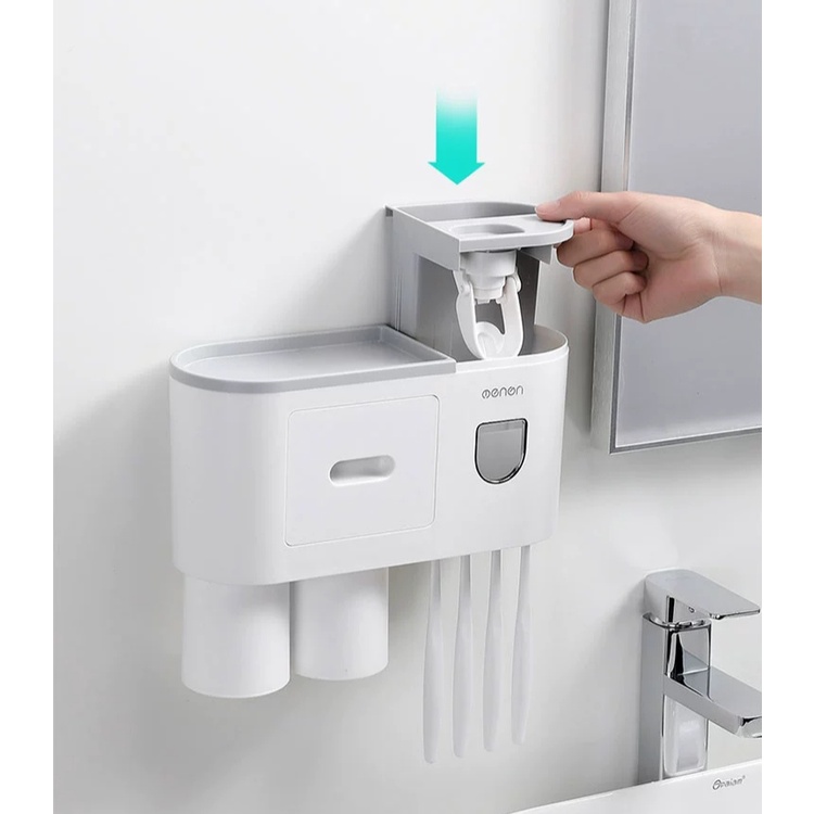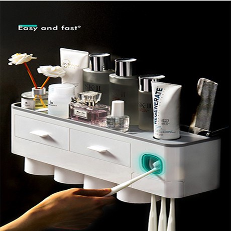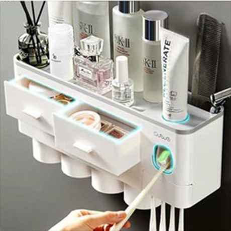 - Sản phẩm bao gồm: 1 Kệ nhà tắm tích hợp chức năng lấy kem tự động + Cốc hút từ tính + miếng dán tường