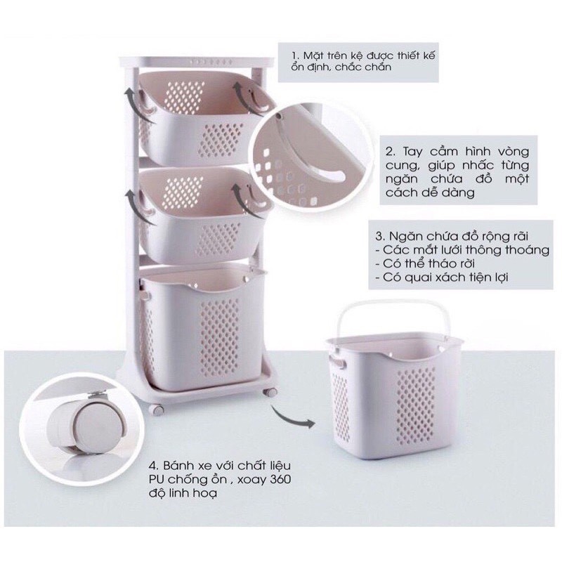 - Kệ đựng gồm 3 Sọt nhựa tương ứng ở 3 tầng + 1 tầng nắp và có bánh xe giúp bạn để được nhiều quần áo, khăn tắm, đồ dùng sinh hoạt hơn. Kệ có thiết kế đẹp mắt, sang trọng, giúp bạn tạo không gian sống thêm gọn gàng và bắt mắt.- Kích thước: : 43,5 x 33,5 x 110,5 (cm)