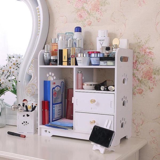 – Kệ đa năng đựng mỹ phẩm và đựng đồ 2 ngăn kéo được cấu tạo từ các miếng gỗ được liên kết với nhau một cách thông minh & chắc chắn, có thể tháo rời khi không sử dụng đến cực kỳ tiết kiệm diện tích & tiện lợi khi mang đi xa.