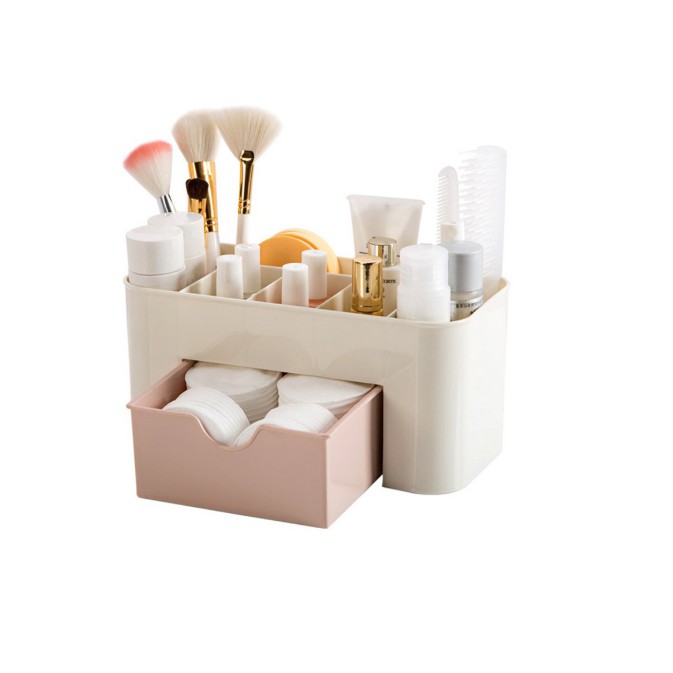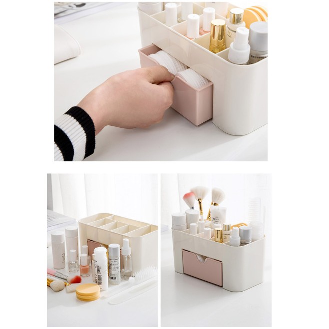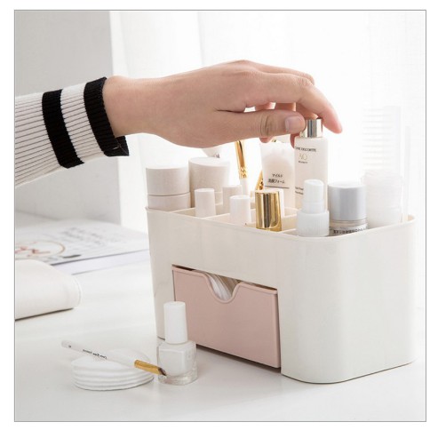 - Chất liệu nhựa cứng cáp,nguyên khối với nhiều ngăn chứa và ngăn kéo giúp cho việc cất giữ mỹ phẩm gọn gàng, đẹp mắt, thuận tiện khi sử dụng.
