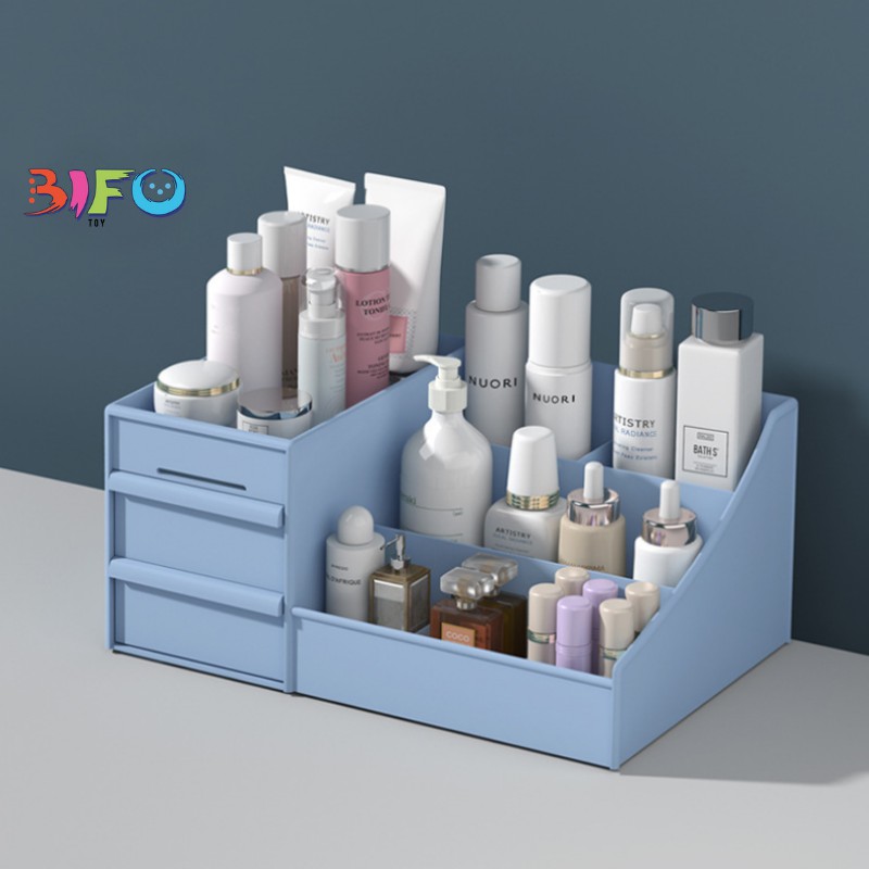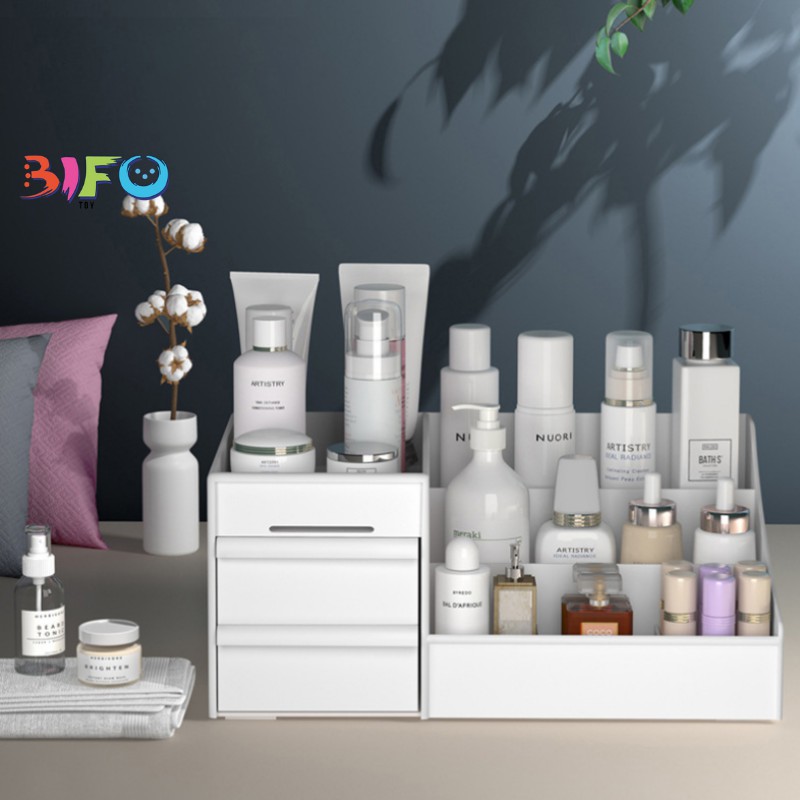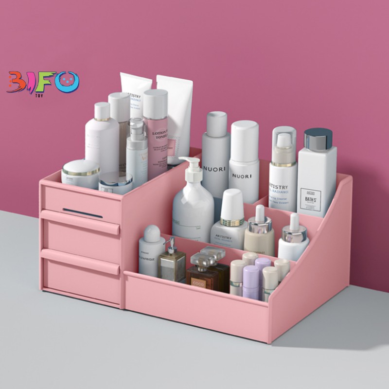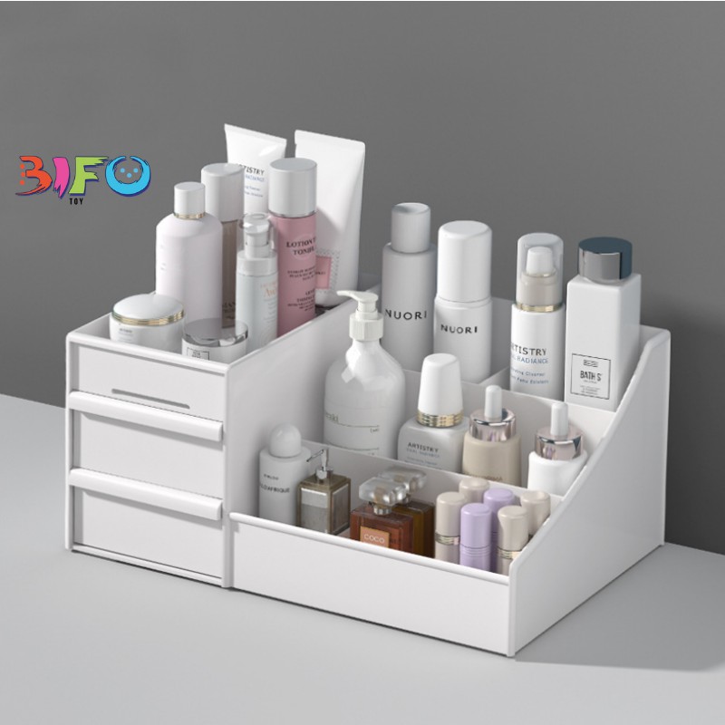 KỆ ĐỰNG MĨ PHẨM ĐA NĂNG 3 TẦNG NHIỀU NGĂN TIỆN DỤNGKệ để đồ mỹ phẩm đa năng được làm bằng chất liệu nhựa an toàn, được thiết kế hợp lý với 3 tầng, 2 ngăn. Hộp kích thước lớn, có thêm ngăn kéo, để được nhiều đồ tiện dụng.