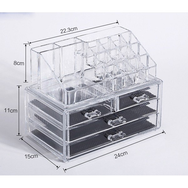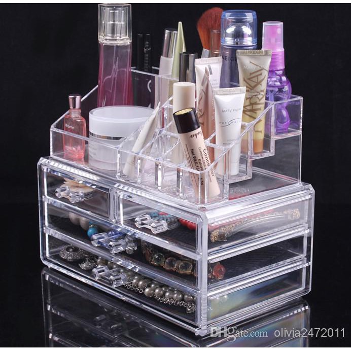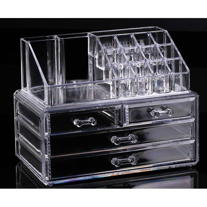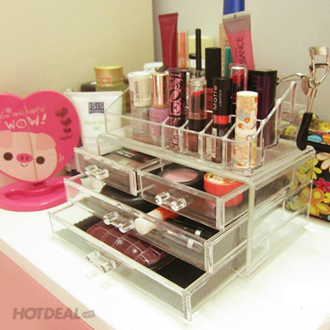 - Kệ đựng mỹ phẩm cao cấp trong suốt, giúp bạn sắp xếp thật gọn gàng và ngăn nắp các lọ son, cây cọ bạn yêu thích vào đúng vị trí, đồng thời còn nhanh chóng hết sức khi cần đến món đồ nào.