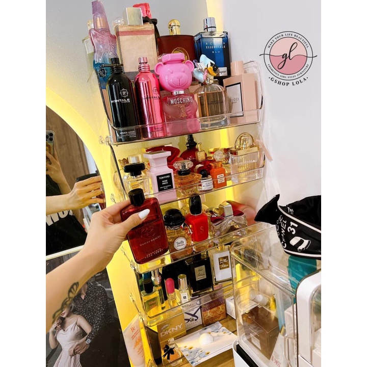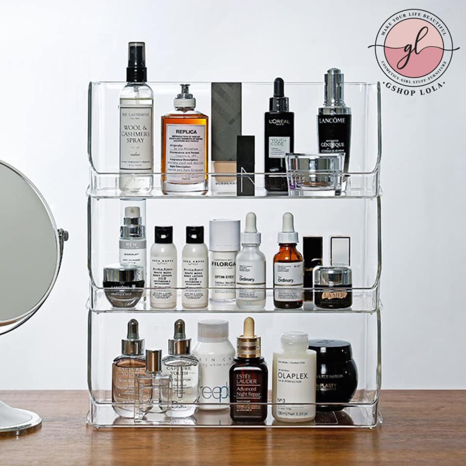 Giới thiệu Kệ đựng mỹ phẩm, nước hoa, đồ skincare nhựa Acrylic sức chứa khủng, xếp chồng thoải mái để nhà tắm