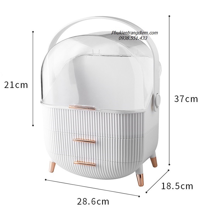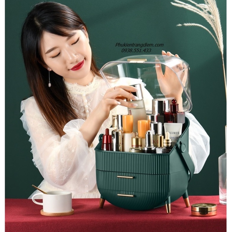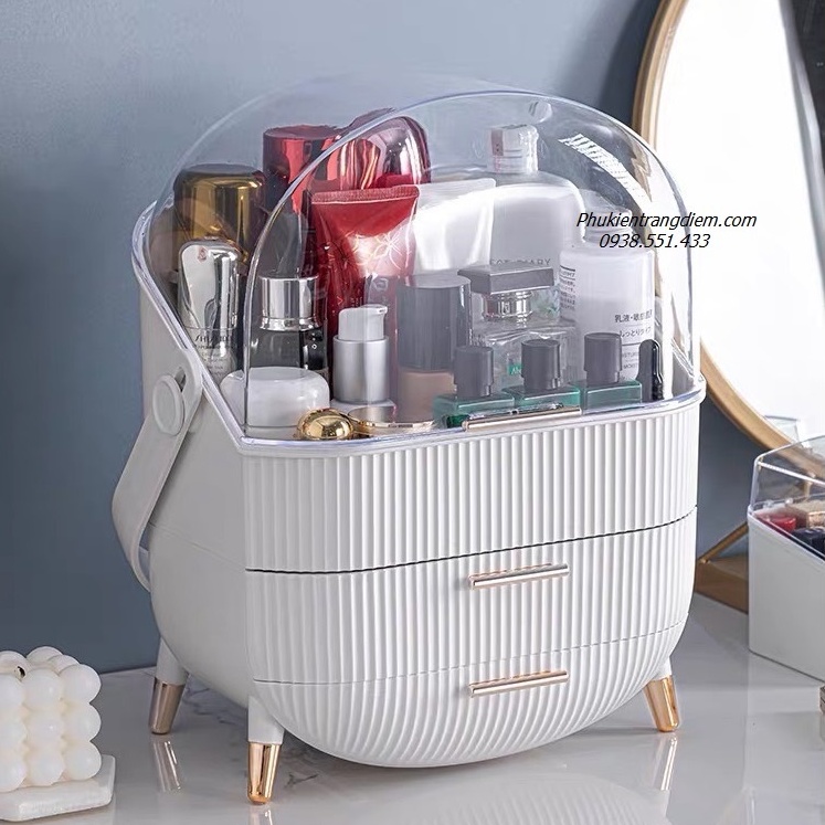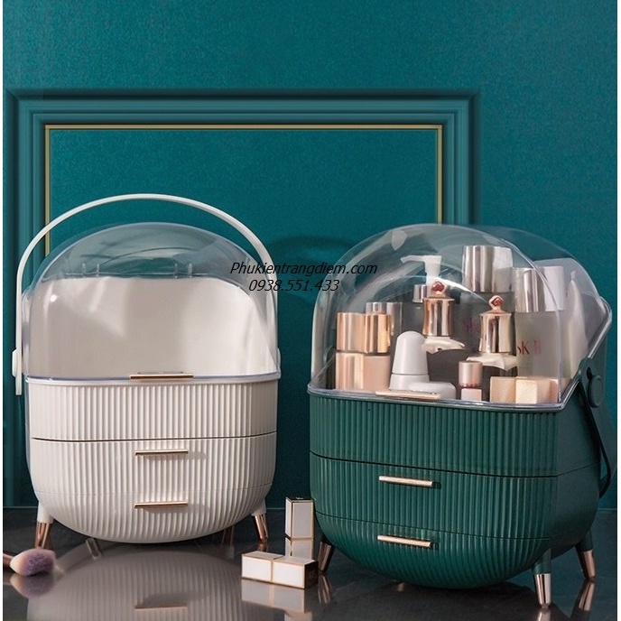 - Kệ Đựng Mỹ Phẩm - Son Môi Có Nắp Xách Tay 2 Ngăn Kéo là mẫu khay hộp trang điểm cao cấp có các ngăn kéo đựng đồ trang điểm và hộp đựng son môi có nắp đậy chống bụi bẩn và o-xy hóa từ môi trường bên ngoài.- Kích thước: 28.6cm x 18.5cm x 37cm