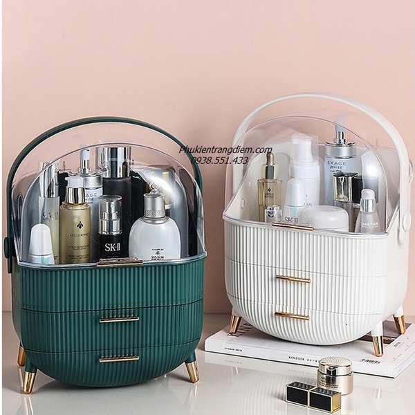 - Sản phẩm có hai màu, màu trắng trẻ trung, màu xanh sang trọng. Bên ngoài hai ngăn kín có bố trí tay nắm kéo mạ vàng bắt mắt, dễ dàng di chuyển. Bên dưới là bốn chân chống giúp hộp đựng mỹ phẩm thêm chắc chắn, vững vàng hơn.