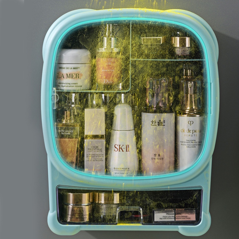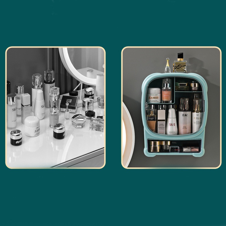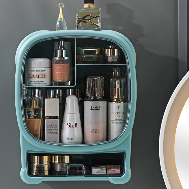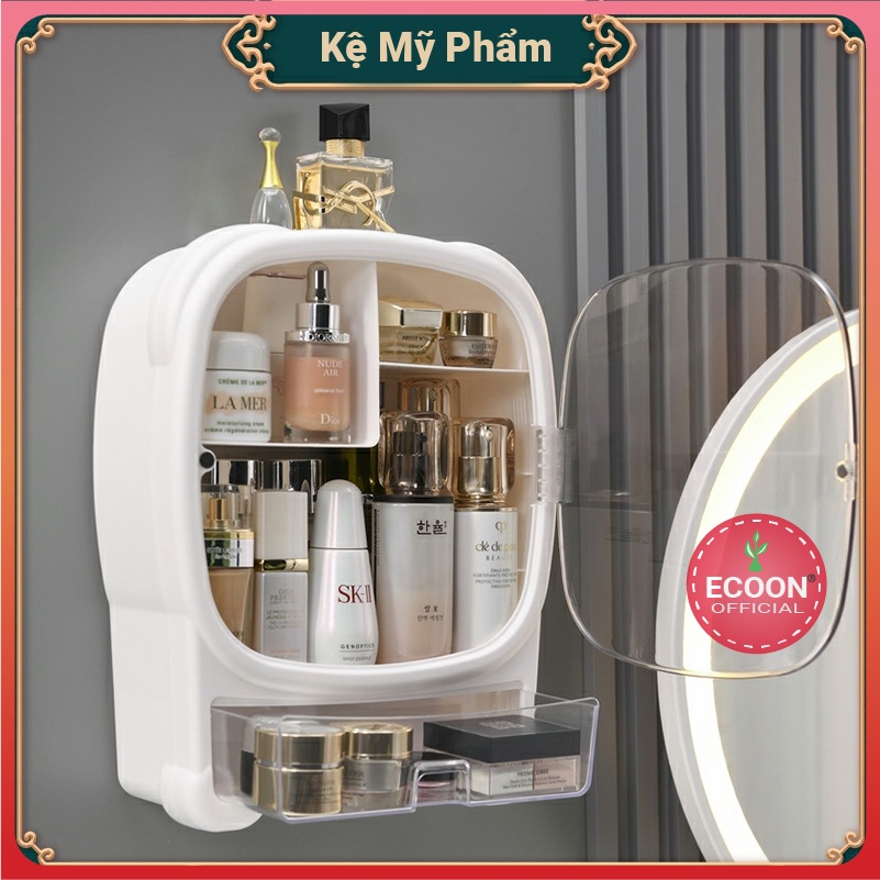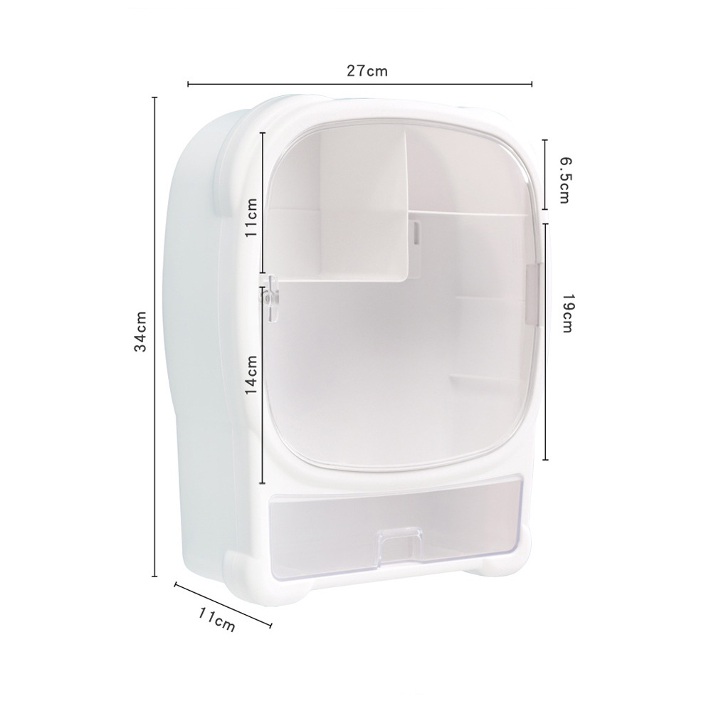 - Kkệ đựng mỹ phẩm treo tường được thiết kế kín, chống bám bụi bám nước, có thể vệ sinh dễ dàng. Kệ thiết kế ngăn có thể đựng đồ trang sức mỗi khi tắm hoặc vệ sinh.