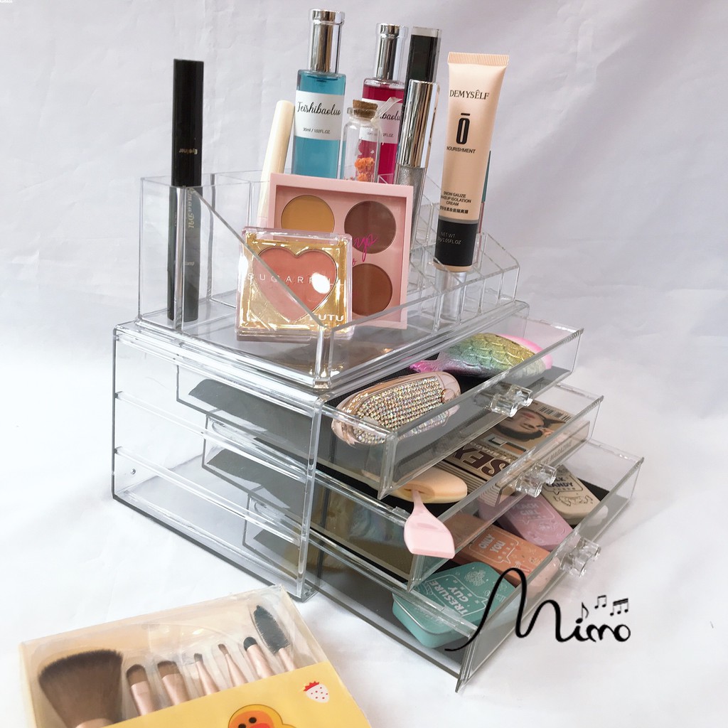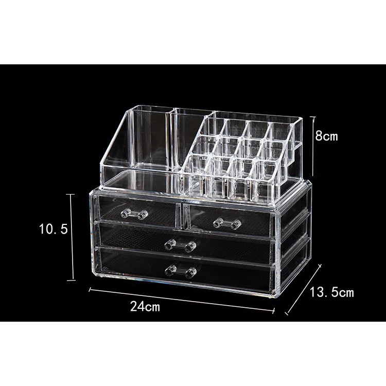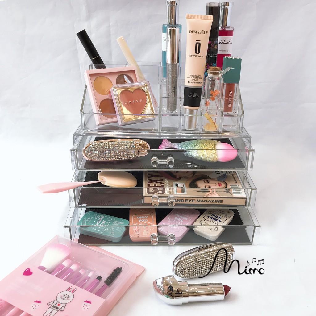 Tên sản phẩm: Kệ đựng mỹ phẩm trong suốt kích thước 18.5*13.5*24cm siêu đẹp , 4 tầng nhiều ngăn trong suốt sang trọngThiết kế khay kệ mỹ phẩm trong suốt thẩm mỹ, có nhiều ngăn và ô nhỏ khác nhau giúp bạn đựng mỹ phẩm cũng những vật dụng cần thiết. Đặc biệt là đối với khay đựng đồ trang điểm xếp tầng có tới 3 ngăn kéo tiện lợi giúp bạn cất giữ trang sức hay đồng hồ như một chiếc hộp đựng đồng hồ một cách an toàn.