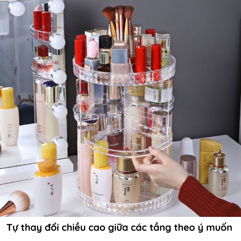❷ Kệ để mỹ phẩm trụ xoay 360 độ được thiết kế hình trụ tròn, với rất nhiều ngăn, ô nhỏ, nhiều tầng… thuận tiện để các chị em phân loại và sắp xếp các lọ mỹ phẩm, dụng cụ trang điểm và những đồ cá nhân khác. Kệ có kích thước lớn nên thoải mái để các lọ mỹ phẩm cao, to mà không lo vị rơi vỡ .
