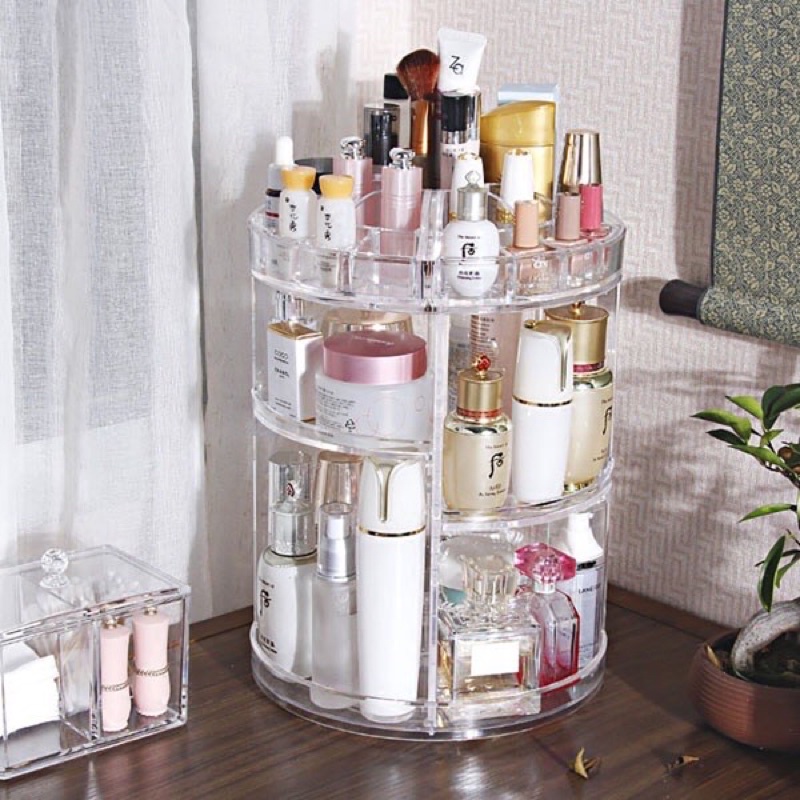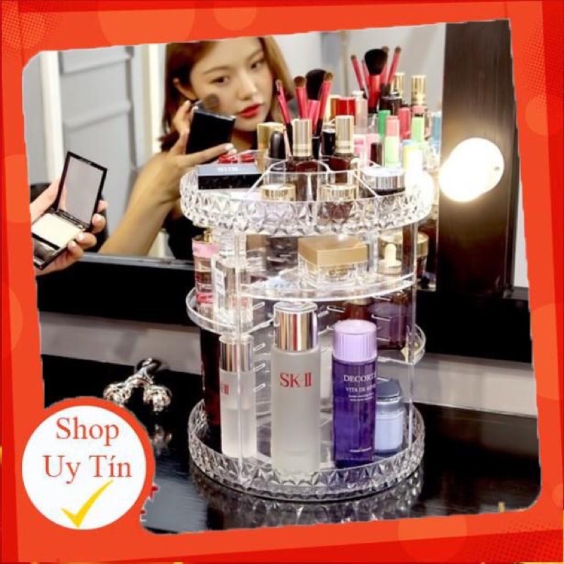 🍀 Kệ để mỹ phẩm trụ xoay 360 độ được ví như một chiếc tủ đựng mỹ phẩm mini với 3 phần chính :