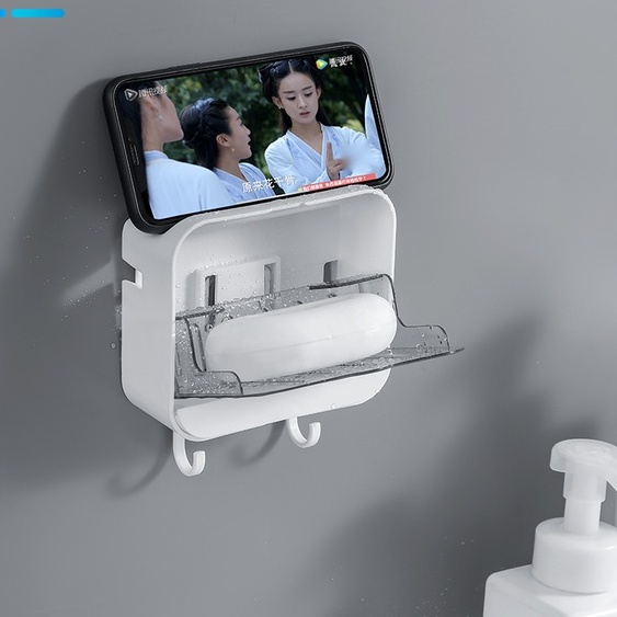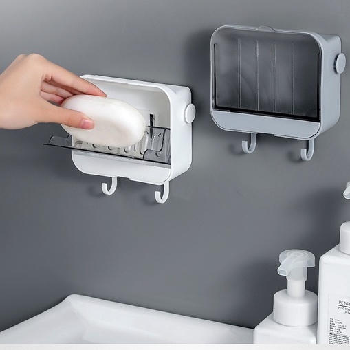 Nhà cửa & Đời sống > Đồ dùng phòng tắm > Kệ đựng xà phòng || Kệ Đựng Xà Phòng Nhà Tắm Có Nắp Thiết Kế Kiểu Hộp Đựng Xà Bông Có Khay Chứa Nước Chảy Xuống Kèm 2 Móc Treo Đồ Tiện LợiCòn hàng