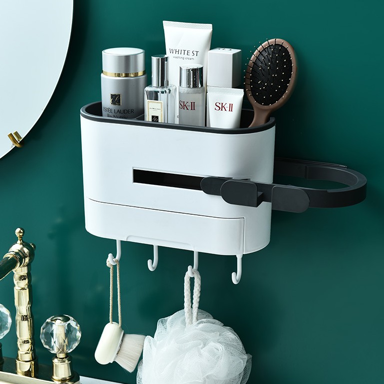 Kệ để đồ nhà tắm dán tường thông minhChỉ việc dán lên tường, không cần đục lỗ tường gây mất thẩm mỹ. Miếng dán siêu chịu lực. Kệ để đồ nhà tắm thiết kế tinh tế, tối giản những vẫn đảm bảo tính đa năng, tiện lợi. Kệ để đồ có kèm nhiều móc treo và chỗ để máy sấy tóc cũng như có ngăn để đồ tránh nước. Giúp cho nhà tắm của bạn trở nên gọn gàng và sạch sẽ hơn.