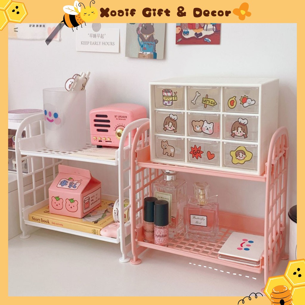Kệ, giá nhựa mini 2 tầng để đồ dùng học tập trang trí bàn học phong cách Hàn Quốc dễ thương
