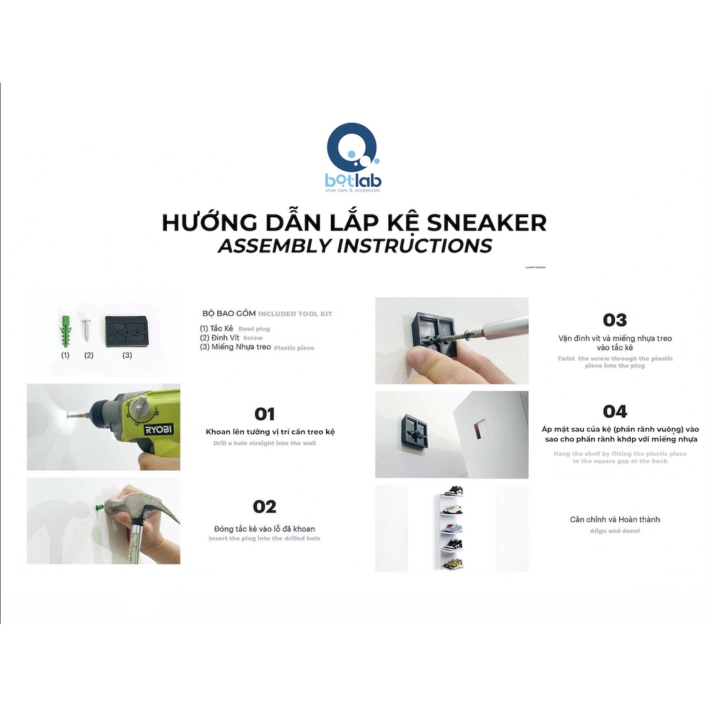 **Cần khoan tường và lắp rắp***- Có thể tháo lắp, khách tự lắp ráp theo hướng dẫn cực kì đơn giản của Bọt Lab được đính kèm khi mua hàng