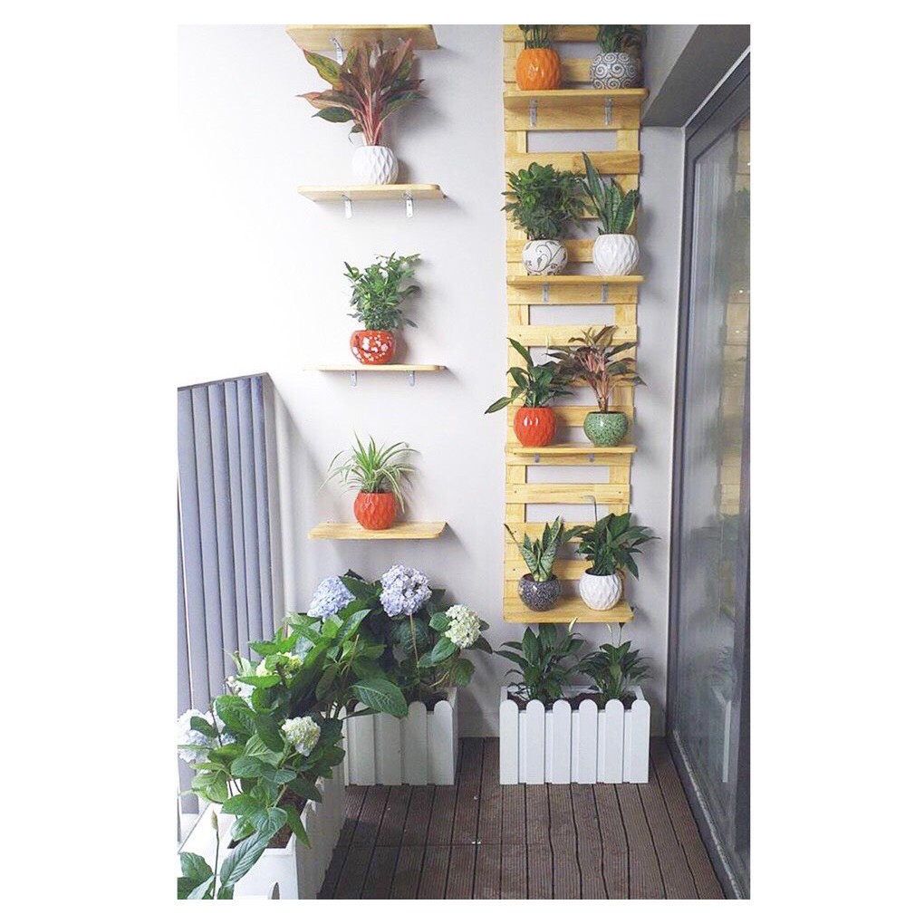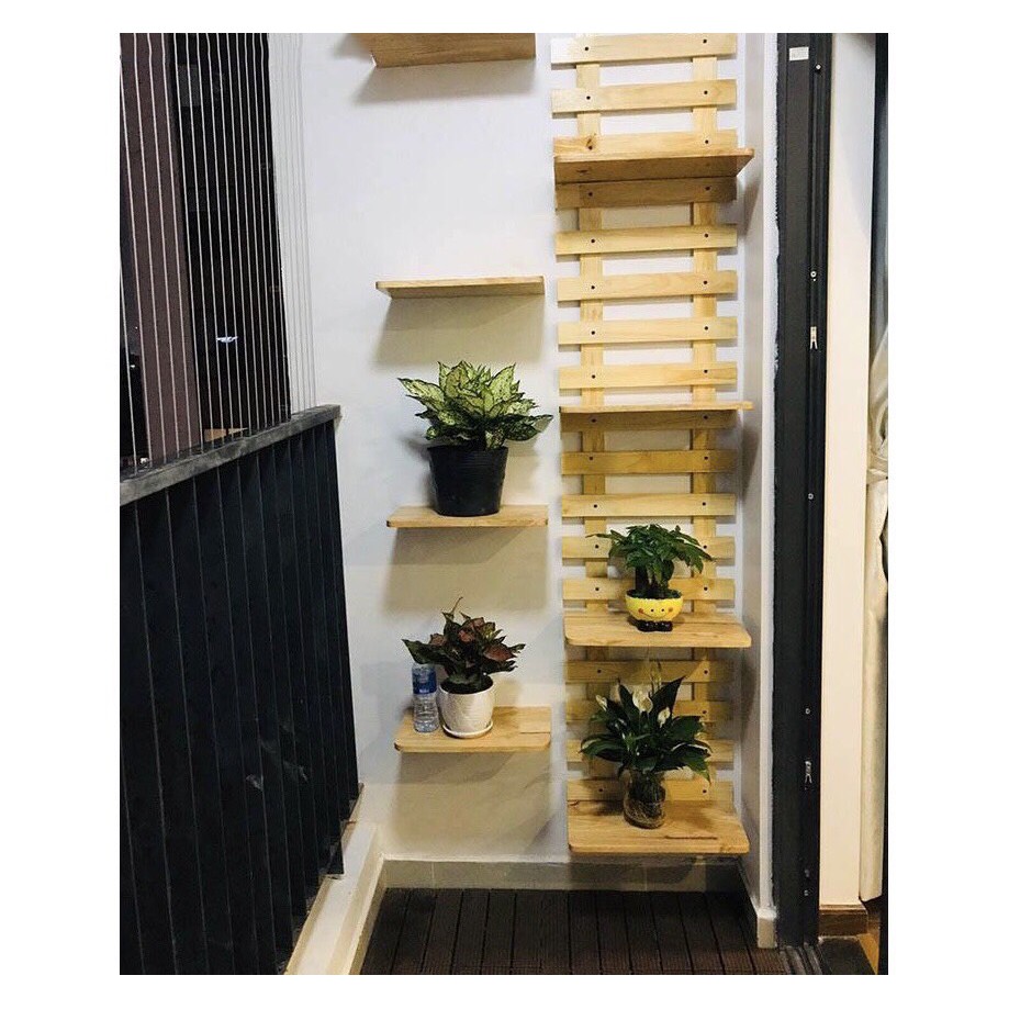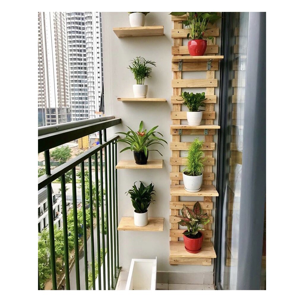 Nhà cửa & Đời sống > Nội thất > Kệ & Giá || Kệ gỗ ban công -Giá gỗ treo tường trang trí ban công gồm 1 hàng rào dài 2mx40cm+8 thanh ngangCòn hàng