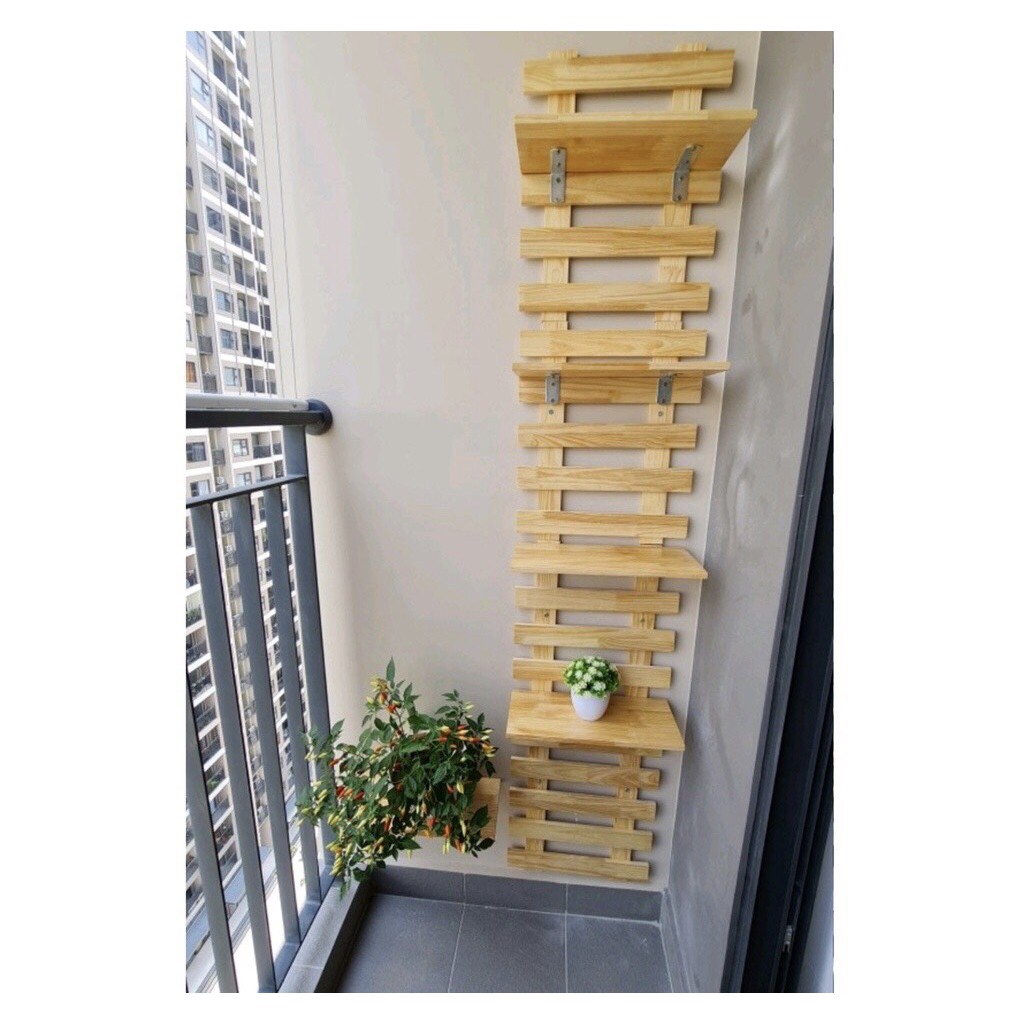 KỆ GỖ BAN CÔNG - GIÁ GỖ TREO TƯỜNG trang trí ban công gồm 1 hàng rào dài 2mx40cm+8 thanh ngangKỆ GỖ TREO TƯỜNG BAN CÔNG làm từ gỗ thông tự nhiên nhập khẩu cực kỳ chắc chắn dùng để trang trí ban công, để chậu cây, chậu hoa, làm gía treo cây cảnh