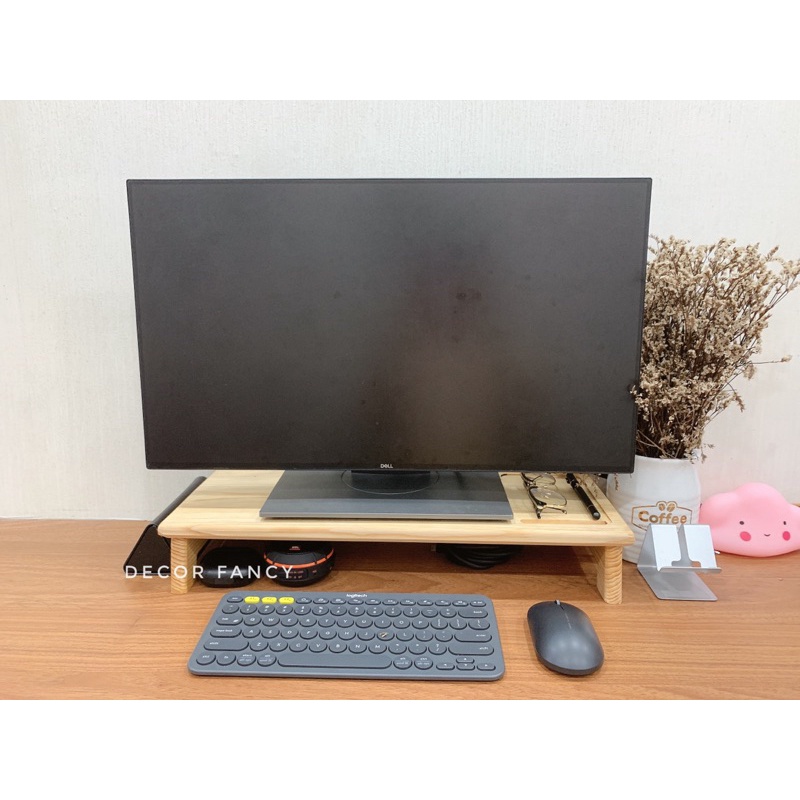 Kệ gỗ để màn hình của Decor Fancy sẽ xoá bỏ mọi sự khó chịu của bạn trong vòng 30 giây. Kệ màn hình Monitor Stand giúp nâng độ cao của màn hình lên để khi làm việc bạn luôn ngồi thẳng theo đúng tỷ lệ an toàn cho cột sống; ngoài ra nó còn là nơi để cất các Keyboard và Mouse khi bạn cần không gian để viết, vẽ, thiết kế và làm việc khác,...Món đồ trang trí mang lại sự tinh tế và tiện dụng cho không gian làm việc của bạn.