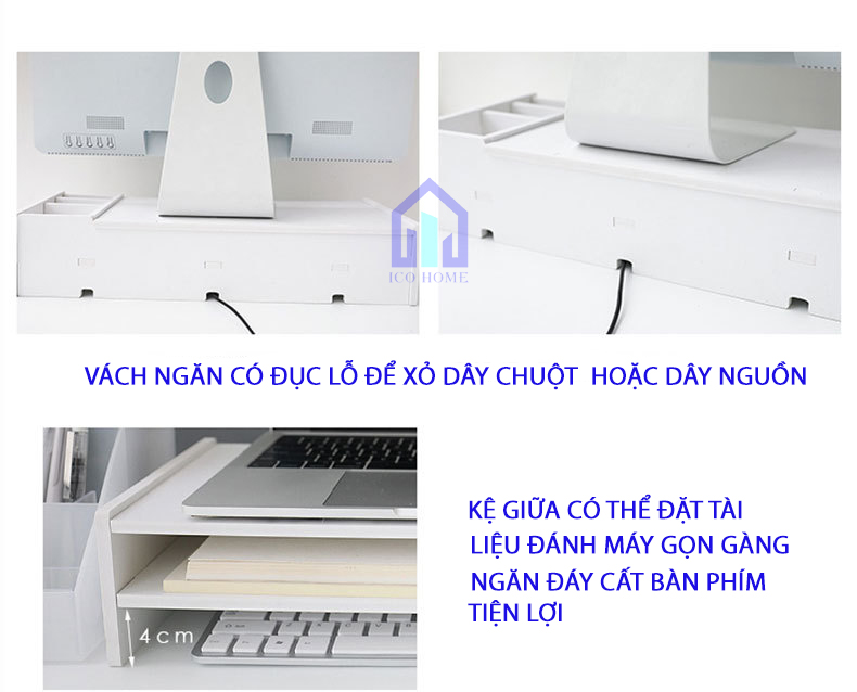 - Kệ gỗ màn hình, kệ để màn hình, bàn kê màn hình giúp bạn ngồi đúng tư thế làm việc; nơi cất gọn bàn phím và chuột giúp mở rộng không gian trên bàn làm việc hiệu quả hơn.