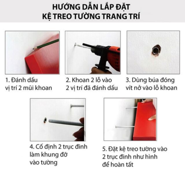 +Bước 1: ướm kệ lên vị trí muốn lắp đặt --> đánh dấu vị trí 2 lỗ khoan