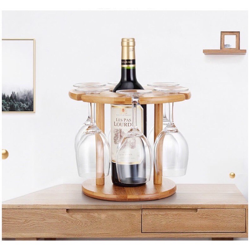 - Thiết kế khay tròn đứng nhỏ gọn với ô đựng rượu chính giữa và 6 khe móc ly xung quanh, sản phẩm sẽ giúp bạn tiết kiệm không gian hơn những loại kệ thông thường.