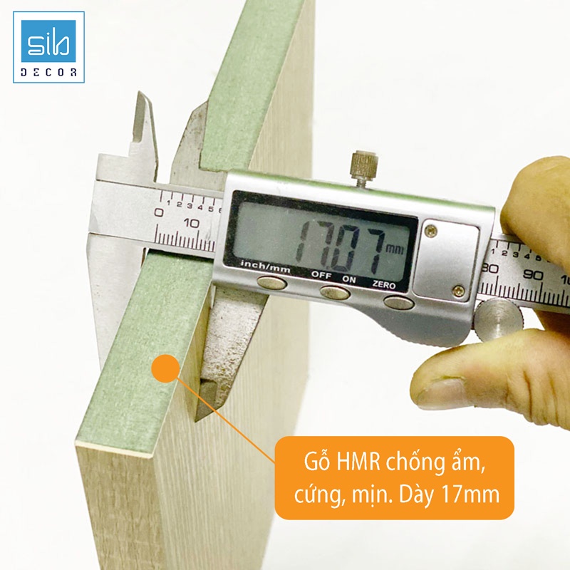 - Chất liệu: Gỗ HMR (MDF lõi xanh kháng ẩm) đặc mịn phủ melamine, chống cong vênh, mối mọt. Gỗ dày 1,7cm.