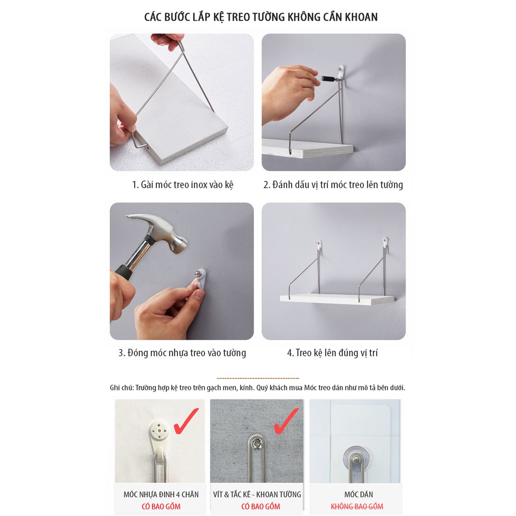 - Bộ sản phẩm gồm: Kệ gỗ; Móc treo inox 2 cái/kệ; Móc treo đinh 4 chân (2 cái/kệ); Vít thép và tắc kê nhựa (tặng kèm cho khách hàng muốn khoan tường để treo); 1 thước thủy (nivo mini) lấy cân bằng.