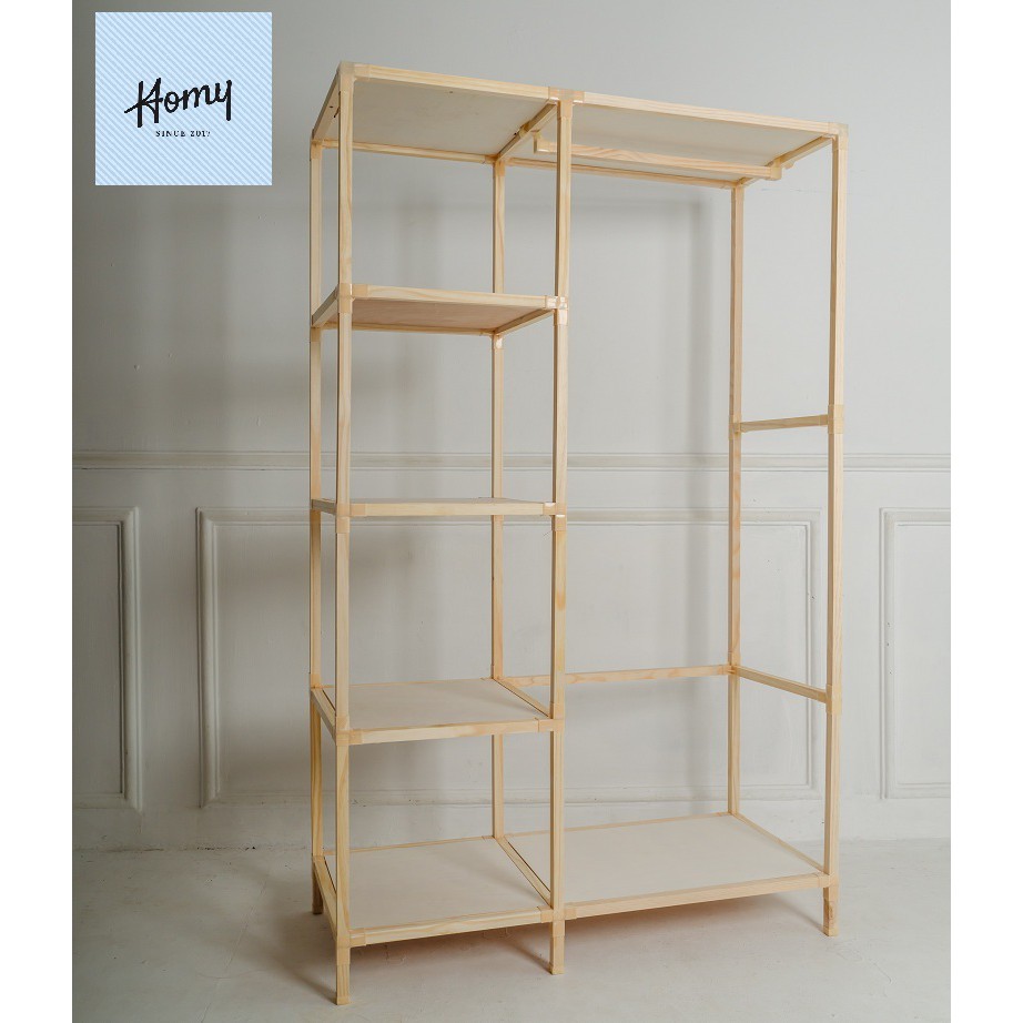 khung gỗ được thiết kế 1 bên treo đồ dài, bên xếp đặt biệt phía trên có lớp ván gỗ bạn có thể để trên đó là vali, đồ dùng dụng cụ chưa dùng đến,