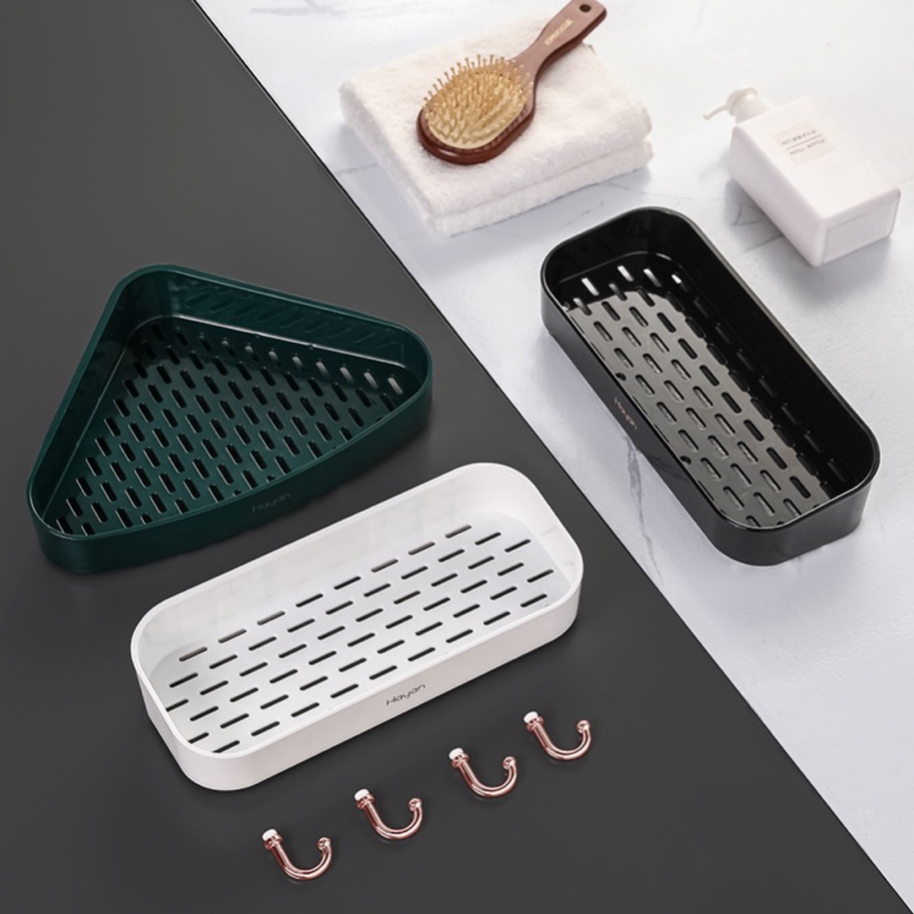 Nhà cửa & Đời sống > Nội thất > Kệ & Giá || Kệ góc dán tường để đồ nhà tắm, nhựa ABS cao cấp kèm móc treo , chữ nhật để dầu gội sữa tắm hũ đựng gia vị dụng cụ bếpCòn hàng
