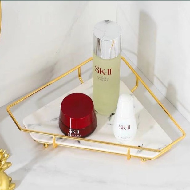 Nhà cửa & Đời sống > Đồ dùng phòng tắm > Kệ để đồ phòng tắm || Kệ Góc Để Đồ Nhà Tắm Tam Giác Chất Liệu Sứ Cao Cấp, Khay Đựng Mỹ Phẩm Vân Đá Khung Mạ Vàng Sang TrọngCòn hàng