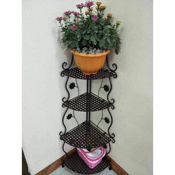 - Kệ sắt có thiết kế hoa văn trang nhã, sang trọng góp phần trang trí góc tường thêm bắt mắt hơn