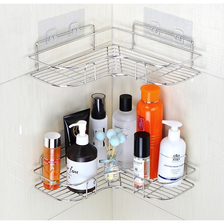👉Kệ góc inox, giá đỡ treo dán góc tường dễ dàng lắp đặt nơi phòng tắm, phòng ngủ đựng mỹ phẩm, chai lọ gia vị trong nhà bếp (2 miếng dán 4 chỗ gài).