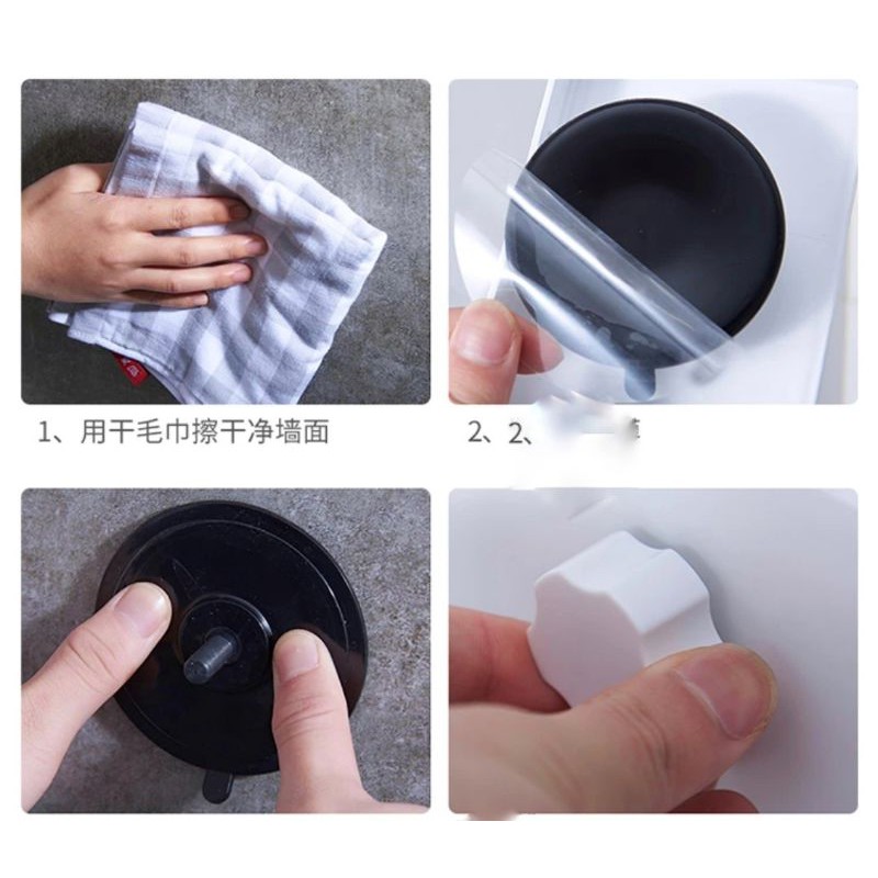 B2: Vặn miếng dính đen ra khỏi kệ dính lên vị trí cần treo kệ và miết chạt miếng dính như hình.