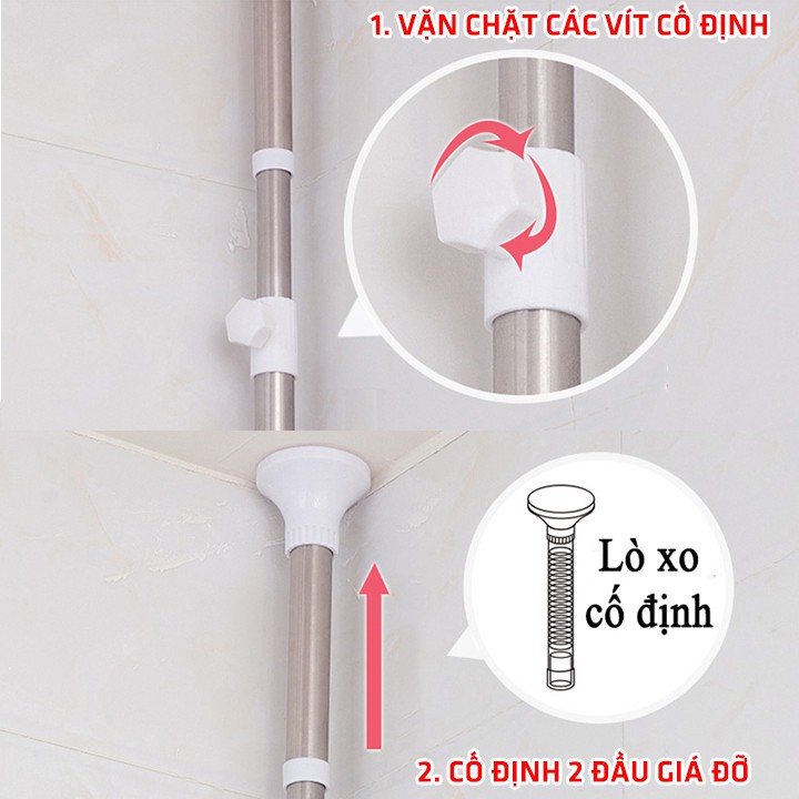 Thiết kế lò xò bên trong trục của thân kệ tạo lực đẩy lên trên 2 đầu cố định của kệ, giúp kệ luôn đứng vững, chắc chắn.