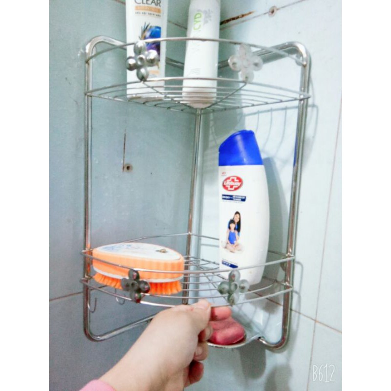 Kệ góc treo nhà tắm inox có khay đựng cục xà bông nhỏ ở bên dưới ,có 2 móc để treo bông tắm.Kệ 2 tầng treo phòng tắm tiện lợi gắn tường nên diện tích phòng tắm trở nên rộng rãi thoáng hơn.
