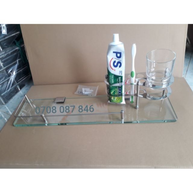 Kệ gương nhà tắm INOX 304 để ly bàn chải, kem đánh răng, kệ kiếng (Kệ PK dài kiếng)