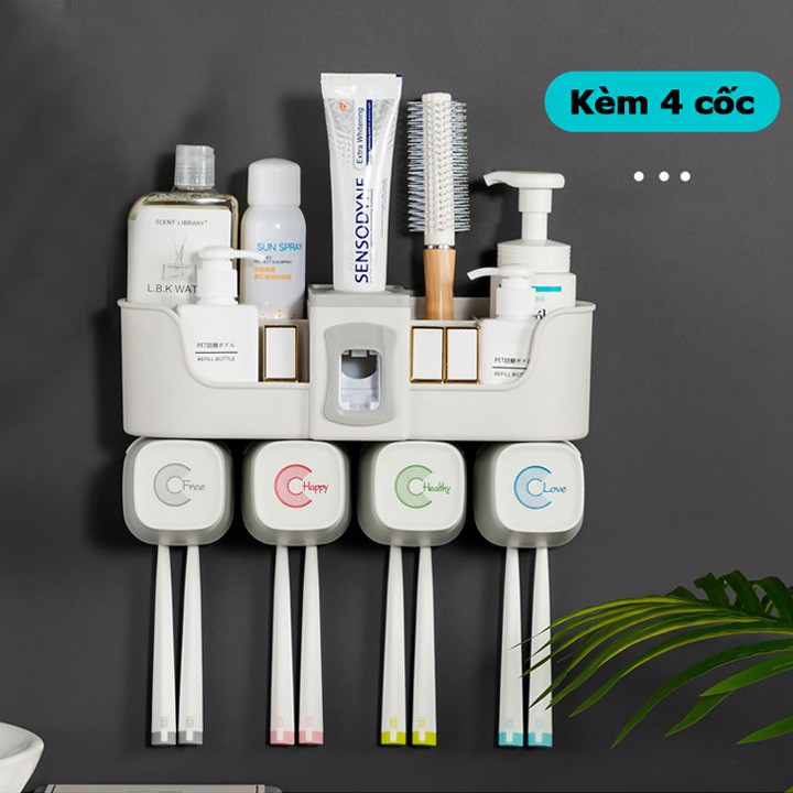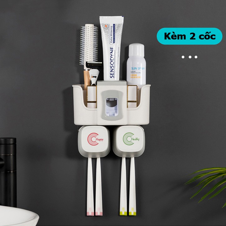 Kệ happy để đồ nhà tắm treo bàn chải đánh răng nhả kem tự động tặng kèm cốc