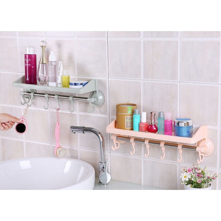 Kệ hít đựng đồ nhà tắm có móc kèm thanh treo khăn-Kệ treo gọn gàng nhà tắm thiết kế thanh ngang với nhiều móc treo tiện dụng là sản phẩm tiện dụng cho nhà tắm, nhà bếp.