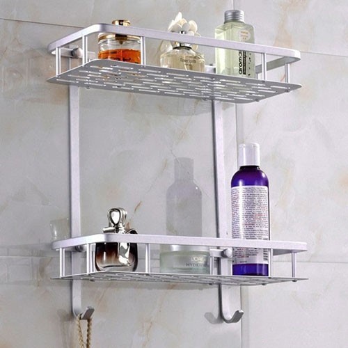 Giá treo nhà tắm 2 tầng hợp kim nhôm có thiết kế hiện đại & đa chức năng với kệ để đồ 2 tầng, 2 móc treo tiện lợi giúp bạn sắp xếp các vật dụng trong phòng tắm hay nhà bếp một cách gọn gàng, ngăn nắp, hợp vệ sinh lại không chiếm diện tích.