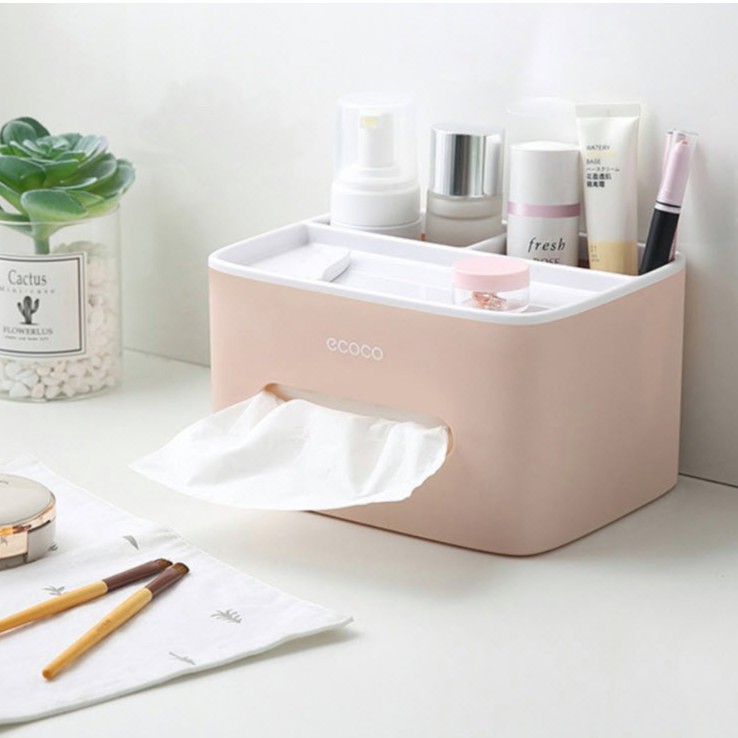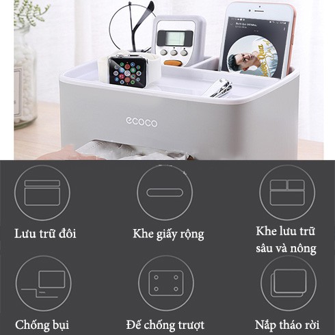 Hộp đựng giấy ăn cao cấp Ecoco với kích thước hộp lớn được chia làm 3 ngăn riêng biệt, ngăn chính phù hợp với khổ giấy ăn 18cm trở xuống. Hai ngăn còn lại có thể để các vật dụng kích thước dài, kệ trên mặt có thể để các đồ vật có kích thước nhỏ.