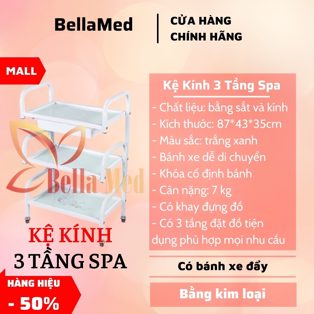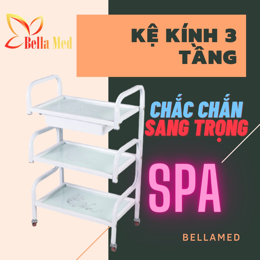 kệ kính 3 tầng có bánh xe đẩy dùng trong spa, phun xăm, thẩm mỹ viện📣 Sản phẩm được cung cấp bởi Bellamed