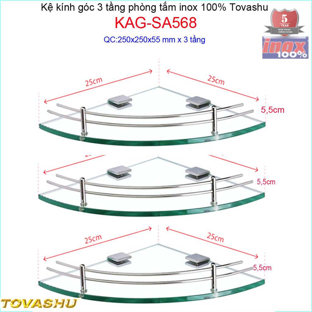 Kệ kính góc 3 tầng nhà tắm, kệ kiếng phòng tắm Tovashu KAG-SA568Chất liệu: Kệ kính góc 3 tầng nhà tắm, kệ kiếng phòng tắm Tovashu KAG-SA568 sản xuất bởi chất liệu Stainless steel cao cấp Nhật Bản, kính dày 10ly khó bể vỡ,