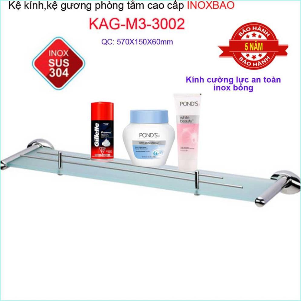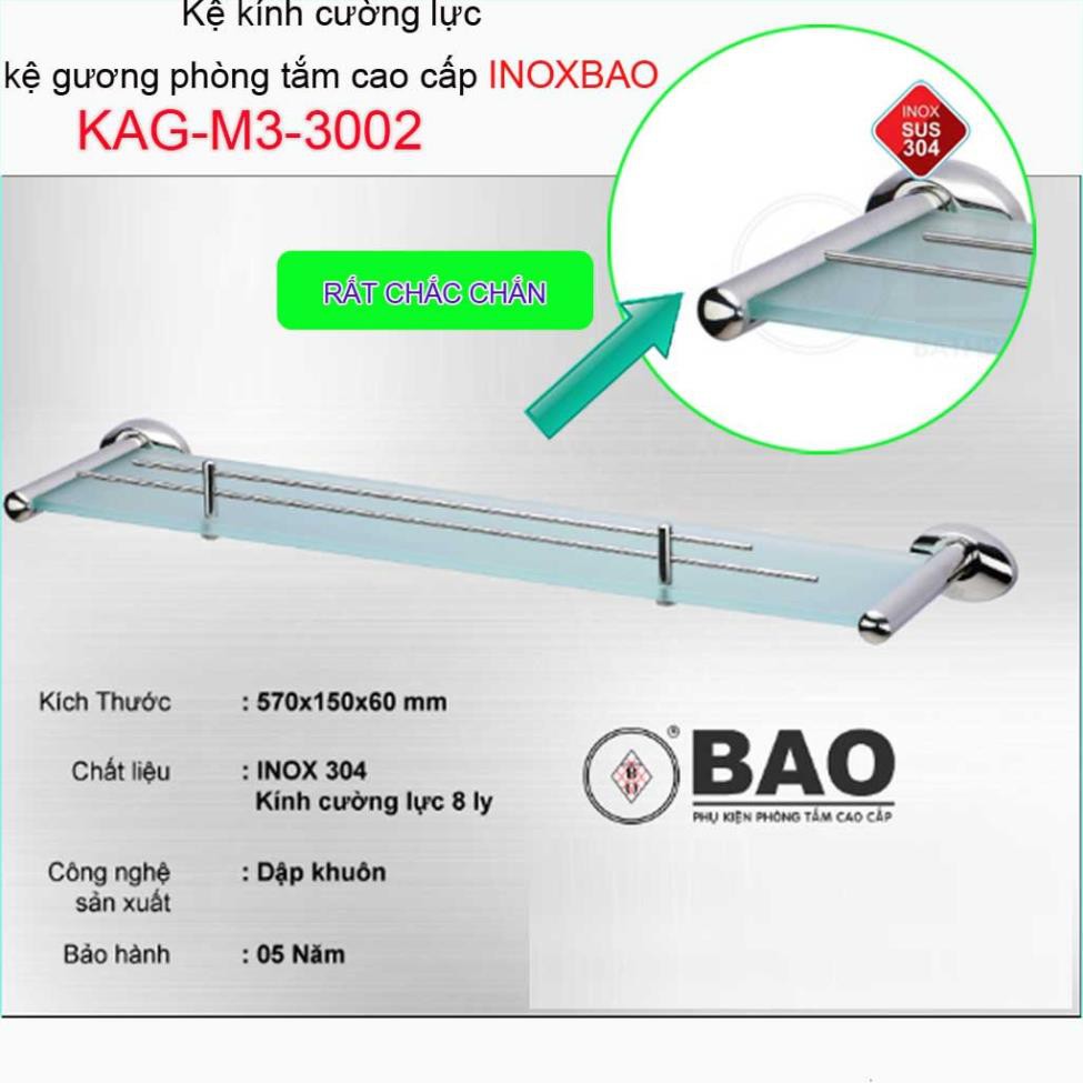 Kệ kính phòng tắm Inox Bảo KAG-M3-3002 làm bằng inox 304 chất lượng cao cấp và kính cường lực 8 ly nên chịu được lực lớn, khó bể vỡ
