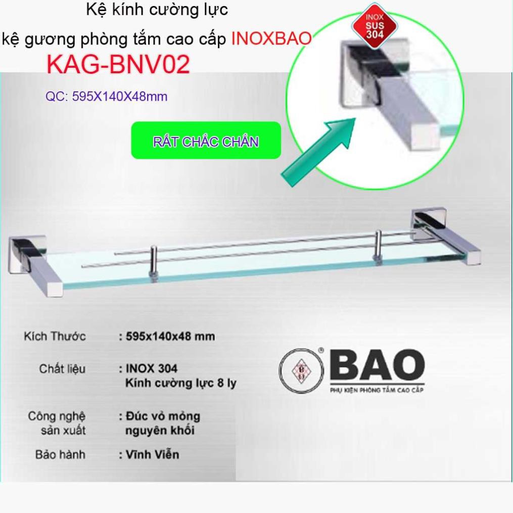 Kệ kính phòng tắm Inox Bảo KAG-BNV02 làm bằng inox 304 chất lượng cao cấp và kính cường lực 8 ly nên chịu được lực lớn, khó bể vỡ