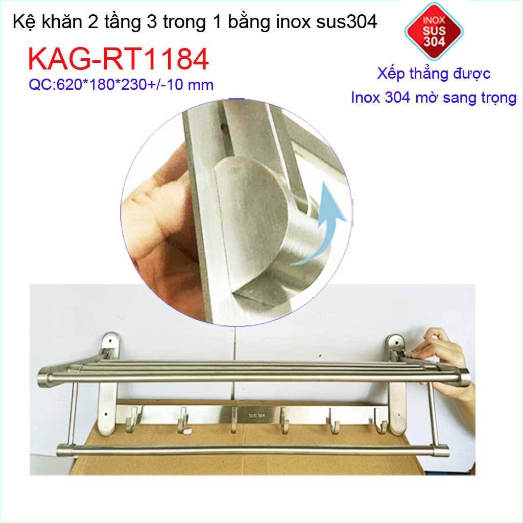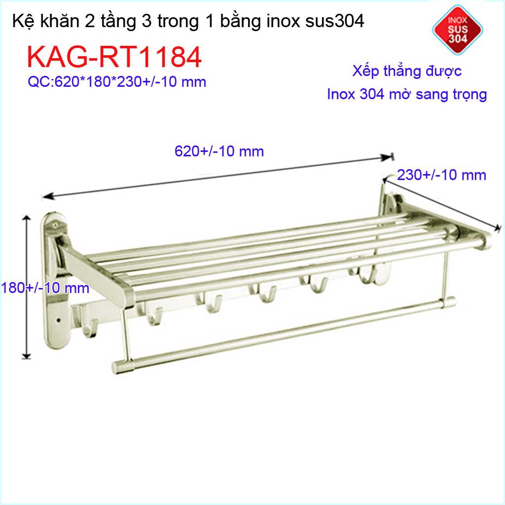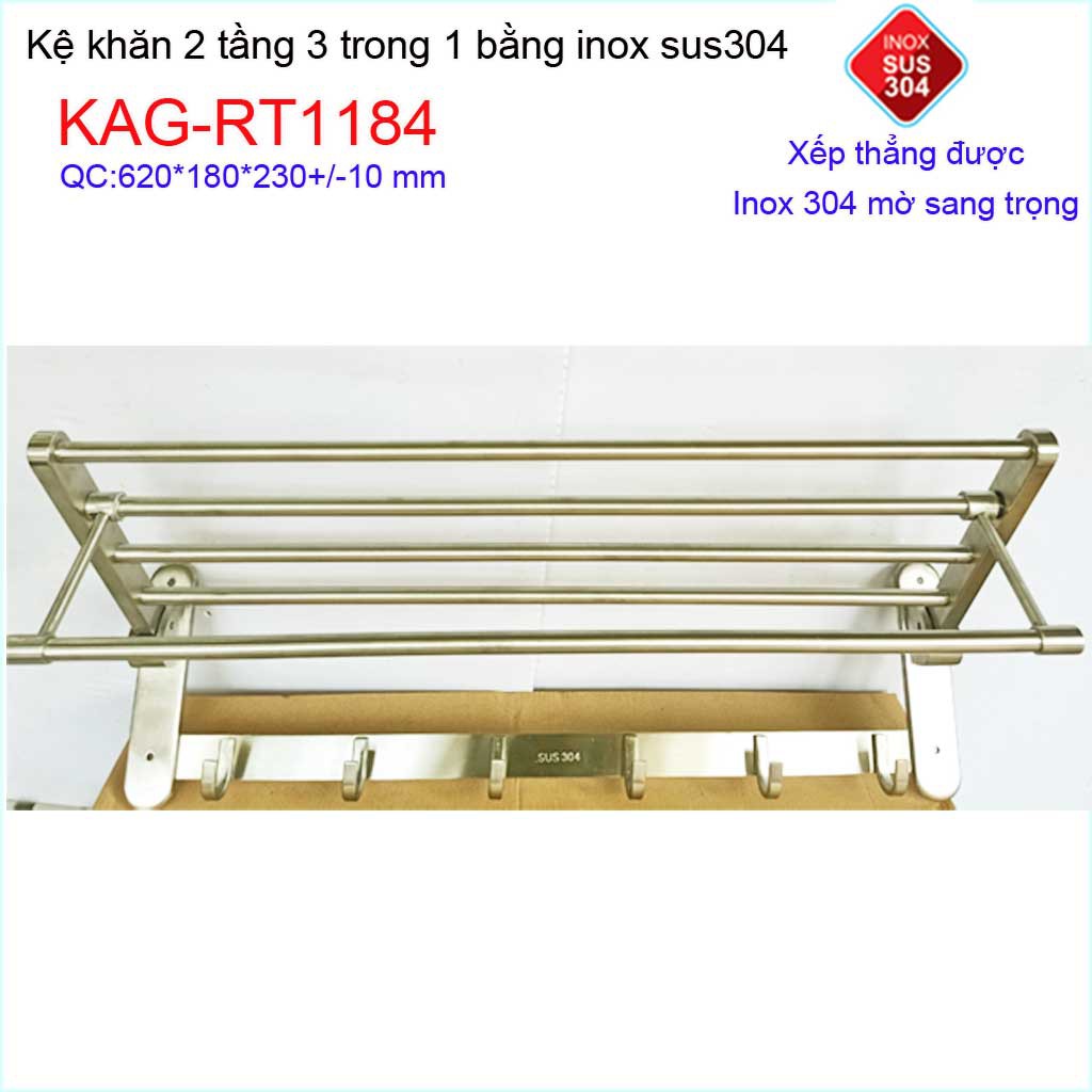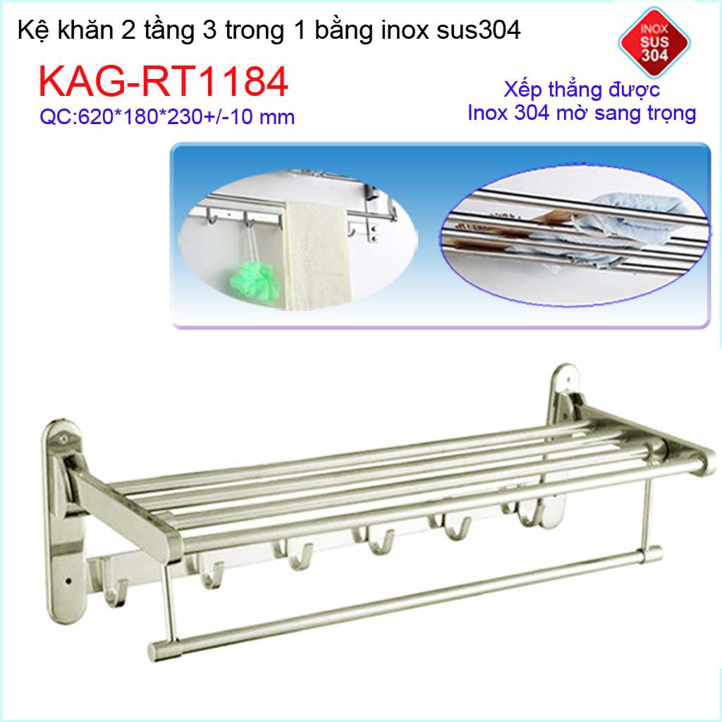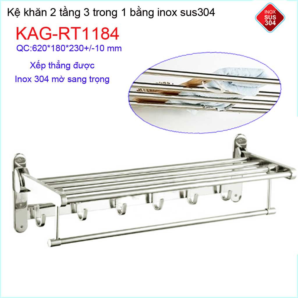 Kệ máng khăn đa năng thẳng lật, kệ treo khăn inox SUS304 3in1 KAG-RT1184- treo khăn + phơi khăn + móc khănKích thước 620mmx230mmx180mm