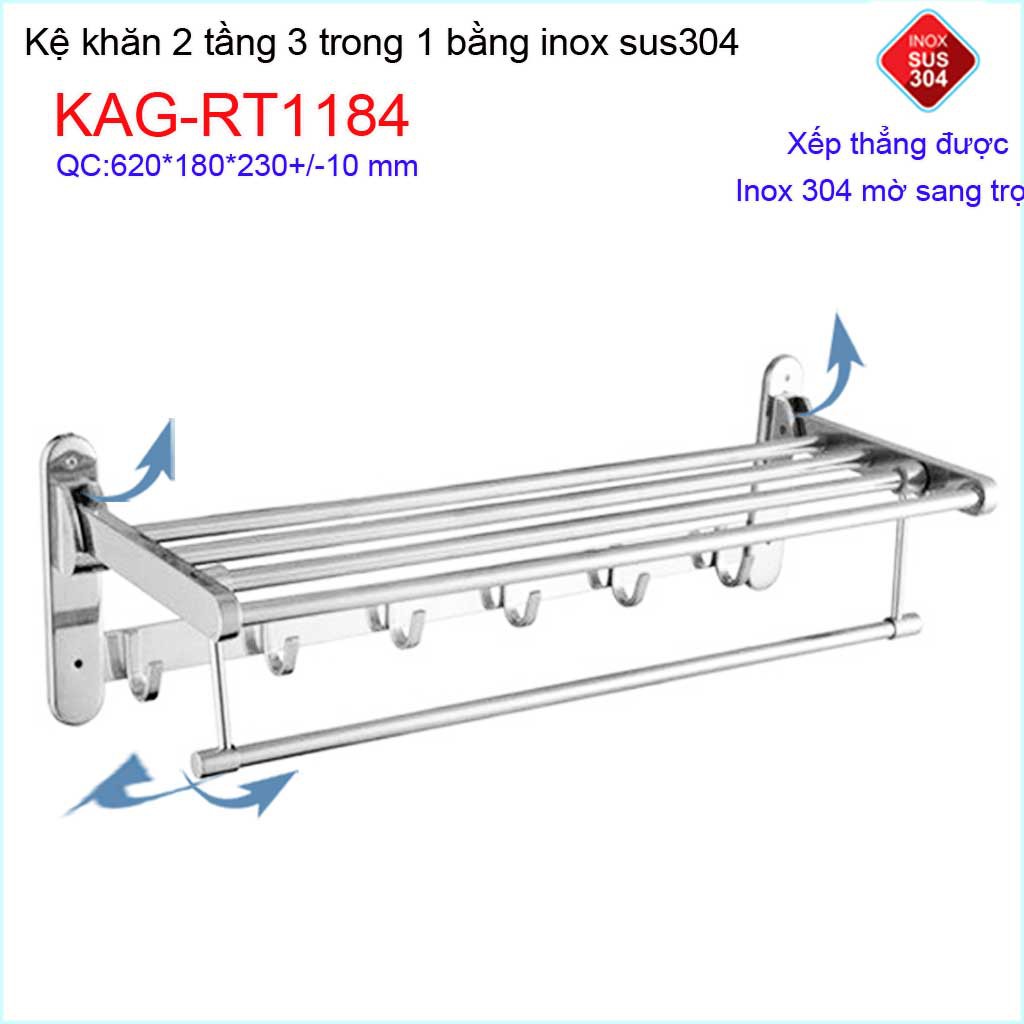 kệ máng khăn đa năng thẳng lật, kệ treo khăn inox SUS304 3in1 KAG-RT1184- treo khăn + phơi khăn + móc khăn